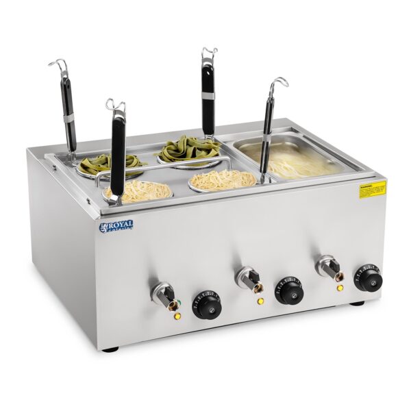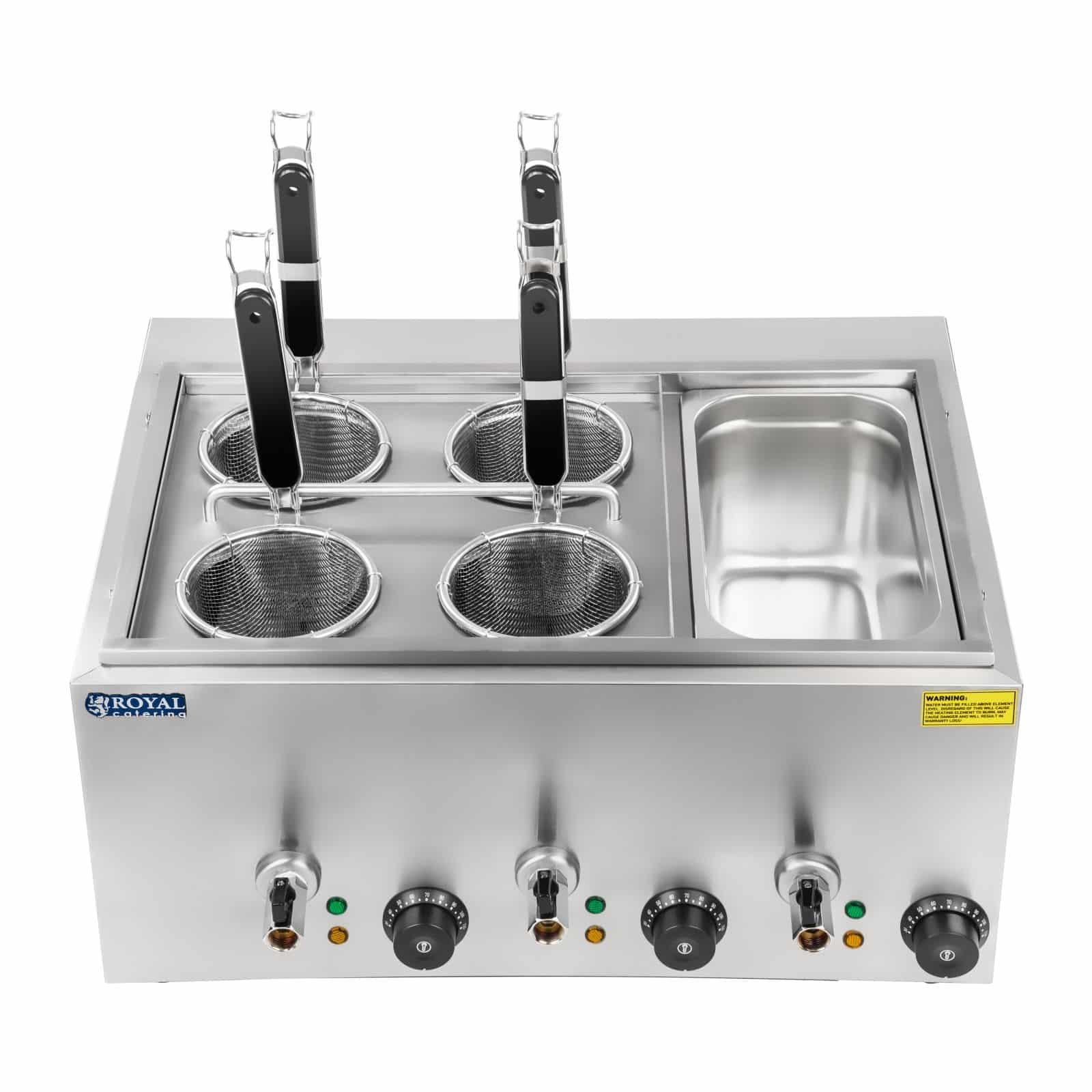 Aparatul electric de fiert paste RCNK-4-GN de la Royal Catering este proiectat pentru uz profesional în fast-food-uri, restaurante și unități HoReCa de orice tip. Datorită celor patru coșuri și puterii de 3000 wați, permite prepararea rapidă a până la 4 tipuri de paste simultan. În plus, aparatul este echipat cu un recipient GN 1/3 pentru menținerea optimă a temperaturii sosurilor pentru paste. Temperatura poate fi reglată individual cu ajutorul a 3 termostate separate. Coșurile cu plasă deasă permit prepararea profesională a tuturor tipurilor de paste, legume sau alte specialități. Datorită robinetului de scurgere pentru apă, economisiți timp atât la preparare, cât și la golirea rezervorului.