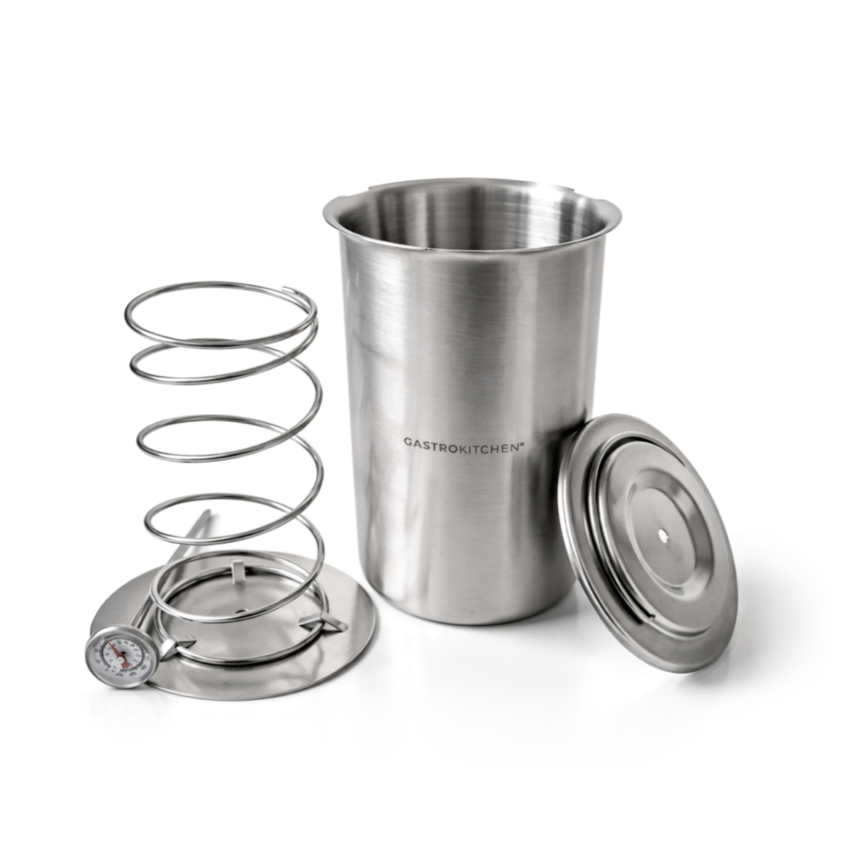 - Conținut pachet: recipient, capac cu termometru, presă cu arc