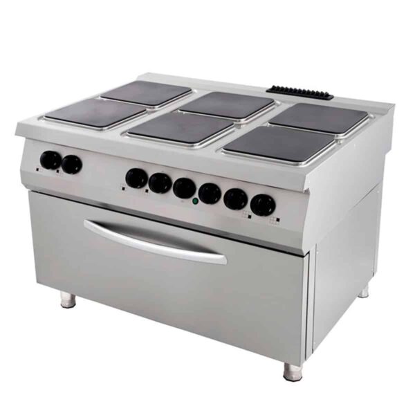 Aragazul electric Premium cu 6 plite și cuptor larg este un echipament profesional și exclusivist pentru bucătării comerciale. Acest aragaz electric robust este conceput pentru utilizare intensivă, iar designul ergonomic face munca mai ușoară. Carcasa este realizată integral din inox, ceea ce permite o curățare rapidă. Plitele din fontă sunt etanșate ermetic și formează o suprafață continuă în partea superioară.