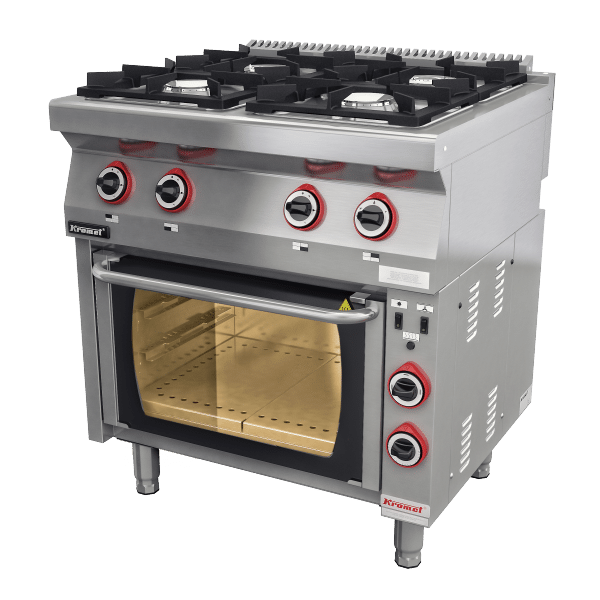 Aragaz pe gaz cu cuptor electric | 700.KG-4/PE-1T de la KROMET este soluția ideală pentru bucătării profesionale complet echipate. Este destinat utilizării în restaurante, hoteluri, cantine și alte unități HoReCa.