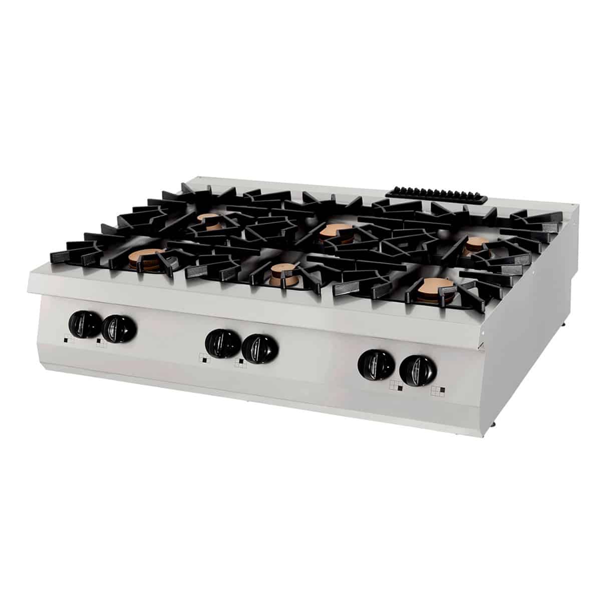 Plita profesională funcționează pe gaz și este echipată cu 6 arzătoare. Această plită este concepută pentru utilizare intensivă, iar designul ergonomic face munca mai confortabilă. Carcasa este realizată integral din inox, ceea ce permite o curățare ușoară. Grătarele pentru tigăi sunt din fontă, iar arzătoarele cromate oferă o putere mare și ardere rapidă. Datorită adâncimii de 900 mm, acest aragaz este ideal pentru tigăi mari. Există suficient spațiu pentru a folosi tigăi mari pe toate arzătoarele.