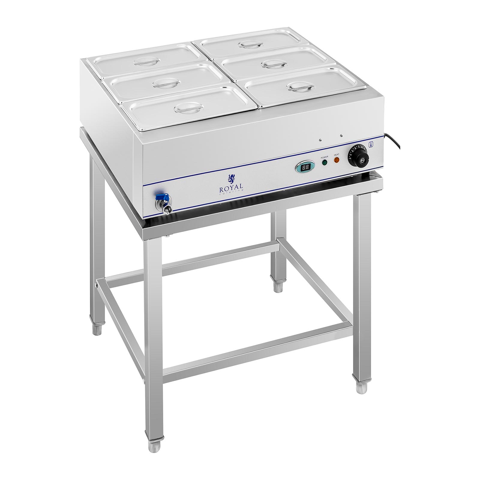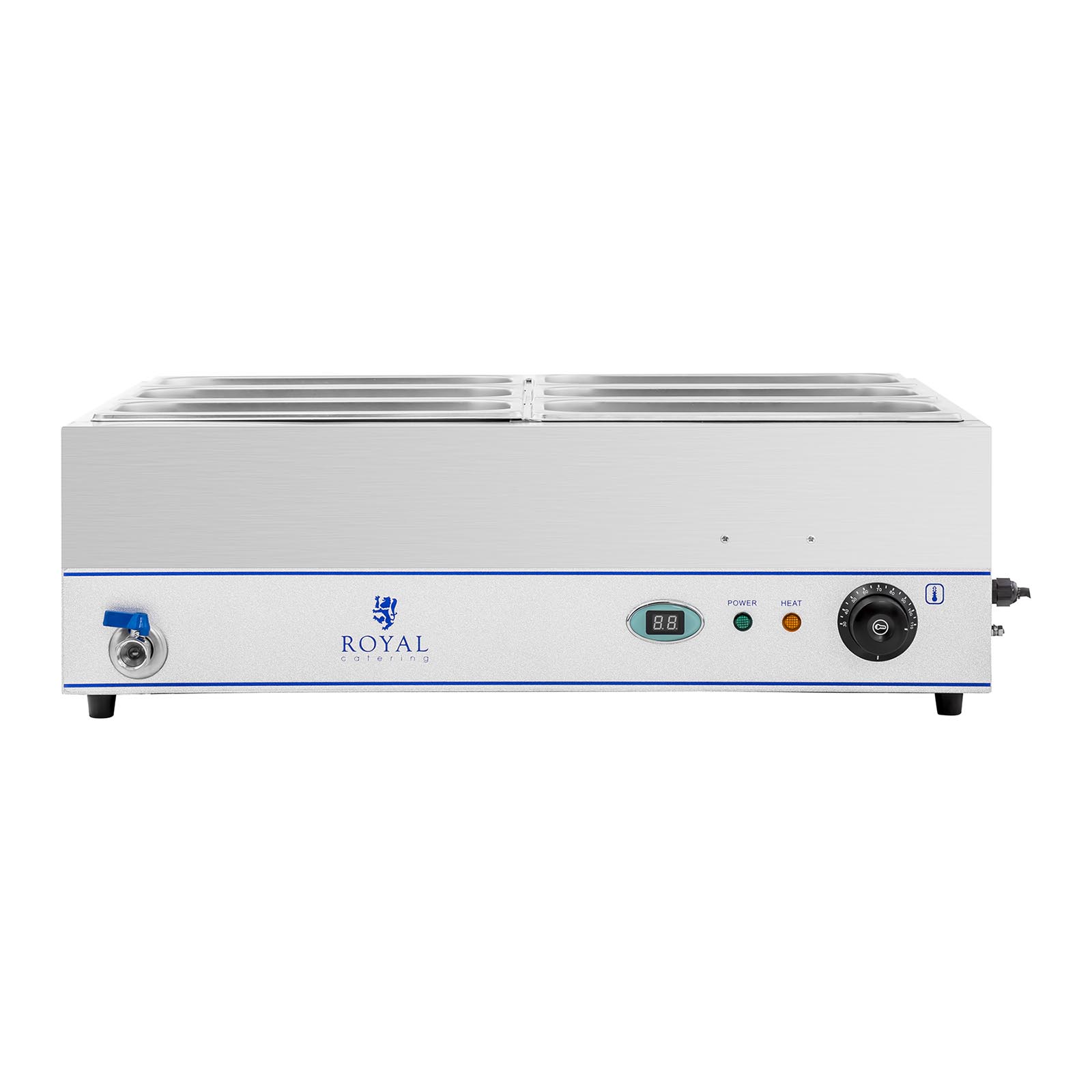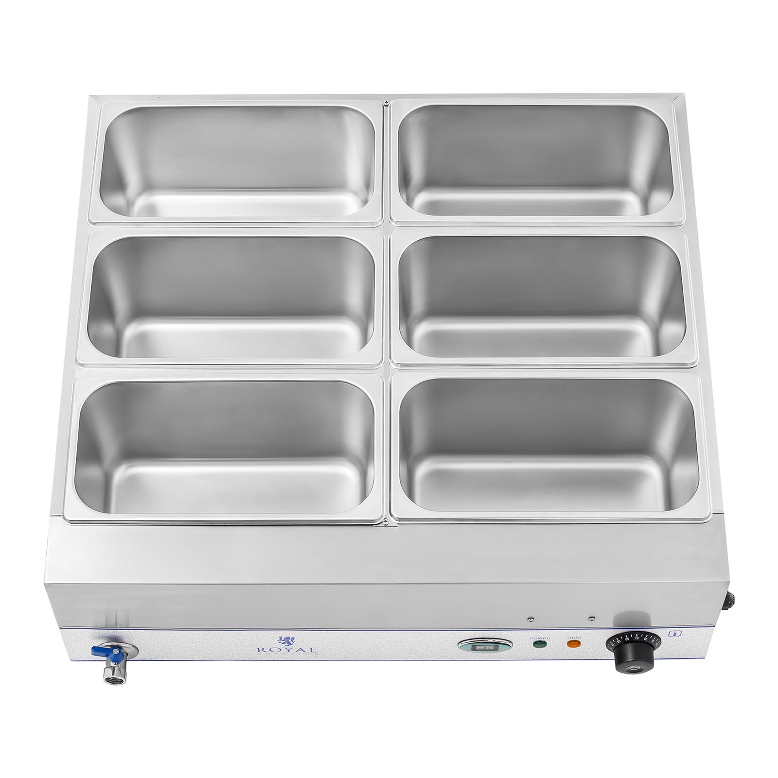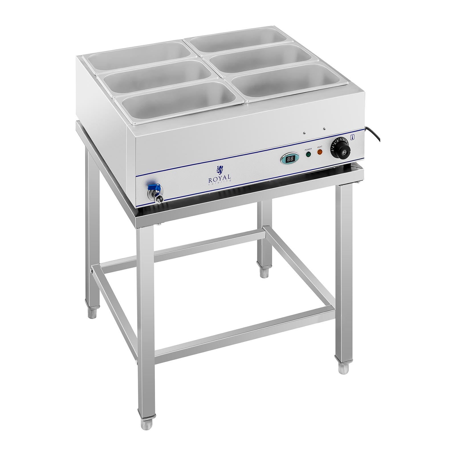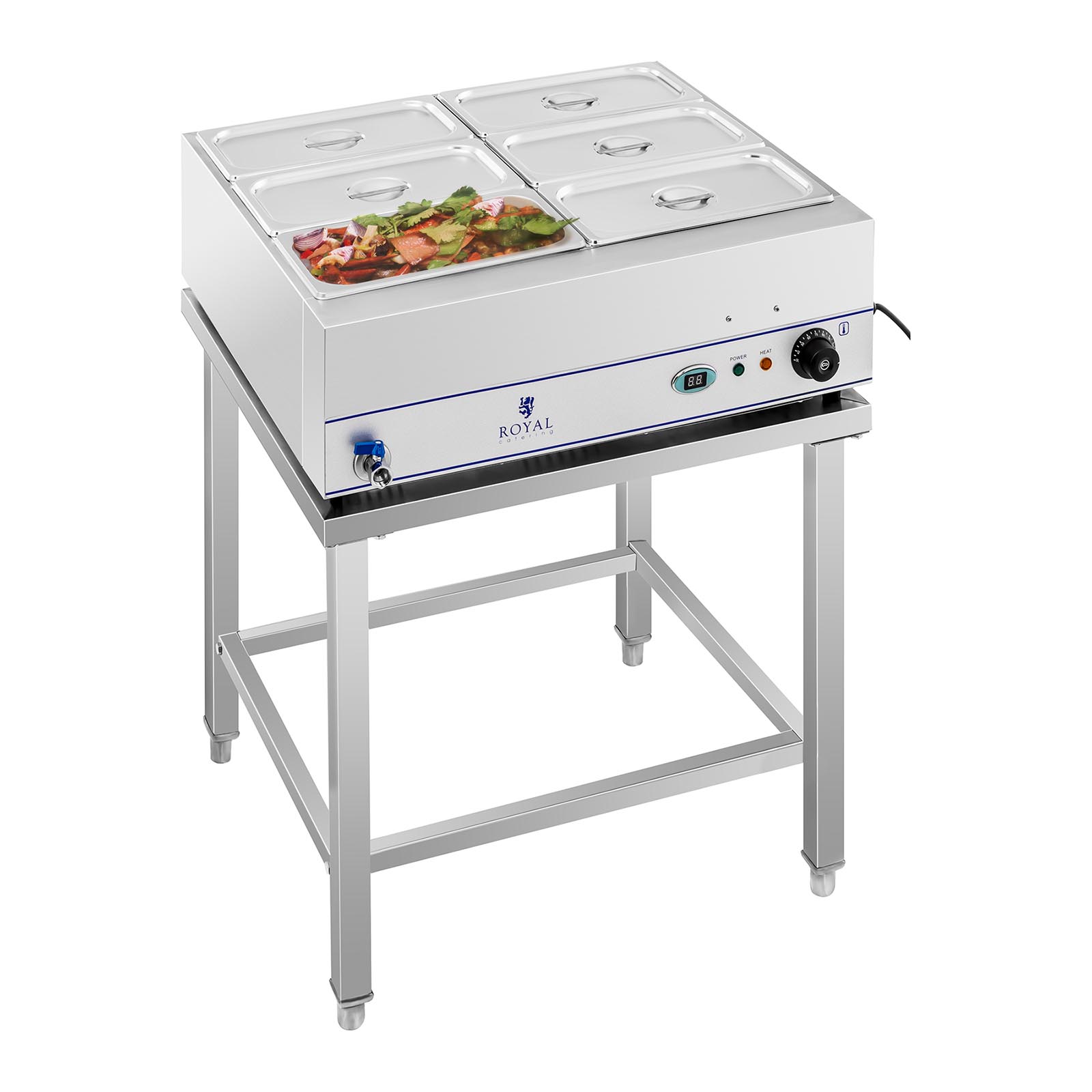 Cu Bain Marie RCBM-6WS-2000 de la Royal Catering, preparatele dvs. vor fi mereu menținute la temperatura optimă. Indiferent dacă este vorba de supe, sosuri, carne sau garnituri precum cartofi sau orez, acest echipament profesional cu o putere impresionantă de 2000 W permite încălzirea rapidă a unor cantități mari de mâncare simultan. Datorită suportului practic, este ideal pentru locații tip self-service precum restaurante, hoteluri, cantine, bufete, cafenele sau pentru diverse evenimente. Puteți folosi în total șase tăvi GN 1/3, dar sunt posibile și alte combinații (ex: 2 x 1/1 GN, 1 x 1/1 și 2 x 1/2 GN sau 12 x 1/6 GN).