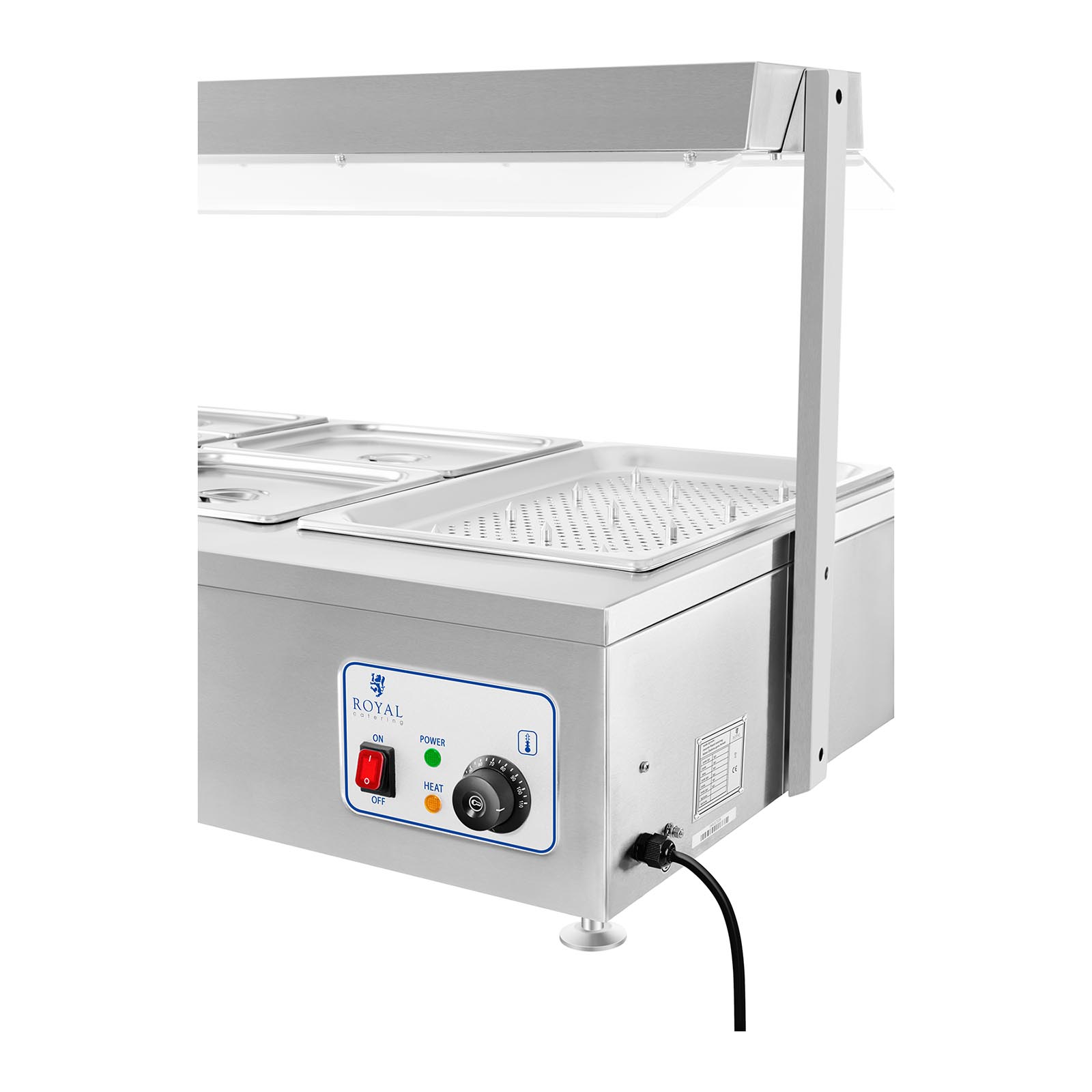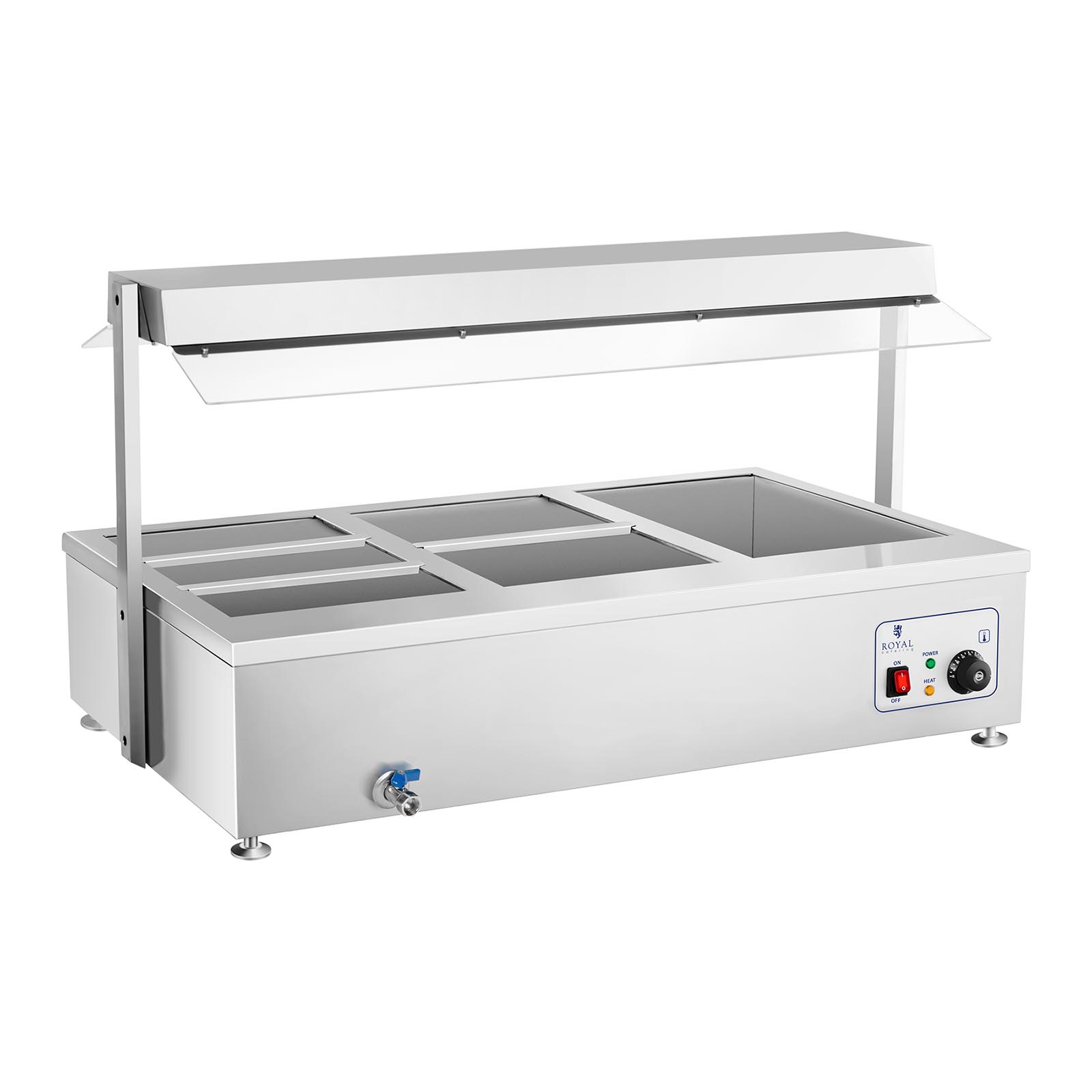 Bain-marie-ul este ideal pentru servirea directă a clienților. Capacul de protecție și iluminarea facilitează munca. Elementul de încălzire integrat are o putere de 2000 W și asigură încălzirea eficientă de jos, menținând temperatura atât pentru cantități mici, cât și mari de alimente.