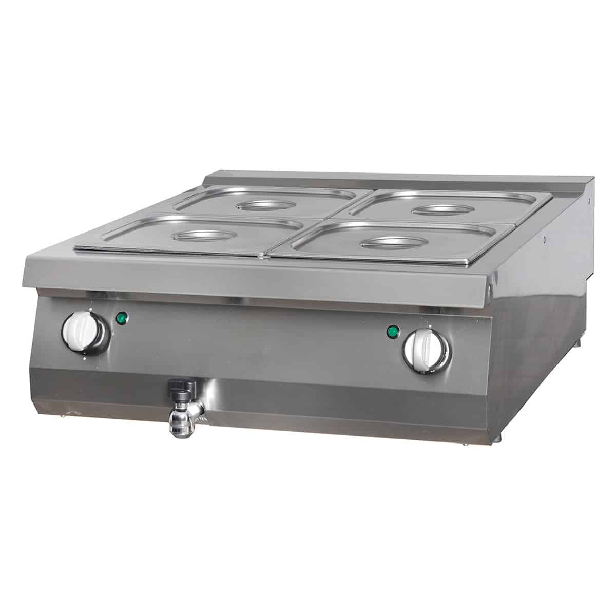 Bain Marie este ideală pentru menținerea temperaturii preparatelor și păstrarea alimentelor calde fără gătire suplimentară. Rezervorul Bain Marie se umple cu apă și se setează temperatura dorită. Apa încălzește tăvile Gastronorm în care puteți pune mâncarea. Bain Marie are un design fără îmbinări și este fabricată integral din inox, ceea ce face curățarea foarte ușoară. Este dotată cu robinet de scurgere pentru golirea rapidă a apei din cuvă. Datorită adâncimii de 900 mm, puteți menține o cantitate mare de alimente calde simultan.