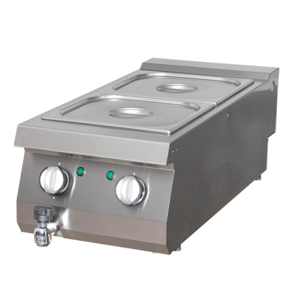 Bain Marie este ideală pentru menținerea la cald a preparatelor și încălzirea alimentelor fără gătire suplimentară. Rezervorul Bain Marie se umple cu apă și se setează temperatura dorită. Apa încălzește tăvile Gastronorm în care puteți pune mâncarea. Bain Marie are un design fără îmbinări și este fabricată integral din inox, ceea ce face curățarea foarte ușoară. Este dotată cu robinet de scurgere pentru golirea rapidă a apei din cuvă. Datorită adâncimii de 900 mm, puteți menține la cald o cantitate mare de alimente simultan.