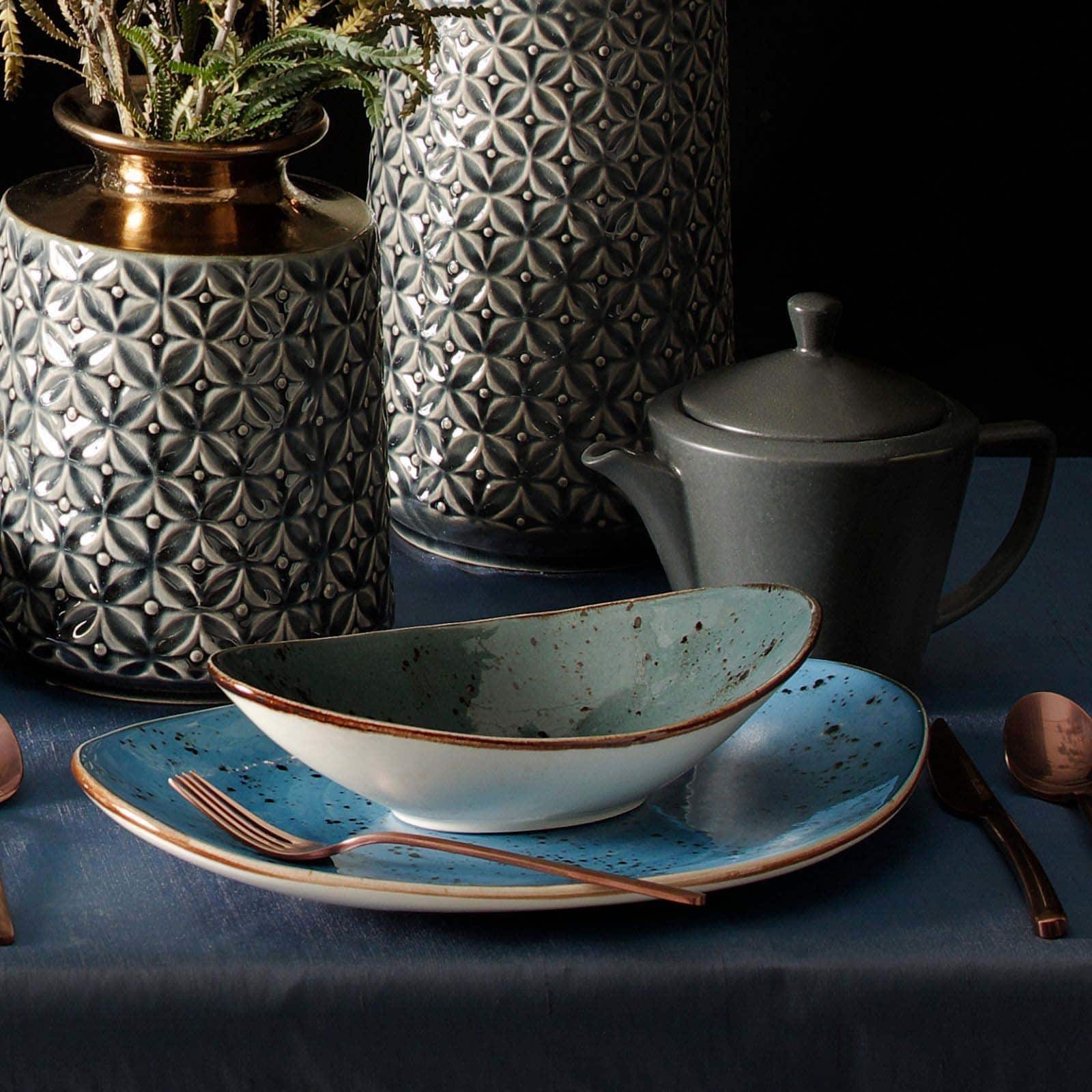 Colecție bogată de porțelan decorat manual, disponibilă în patru culori vibrante. Combinați elemente portocalii, albastre, bleumarin și gri pentru un aspect unic și surprinzător al mesei, iar preparatele vor arăta la fel de bine pe cât sunt de gustoase. Vesela este rezistentă și durabilă, concepută special pentru utilizare intensivă în bucătăriile profesionale.