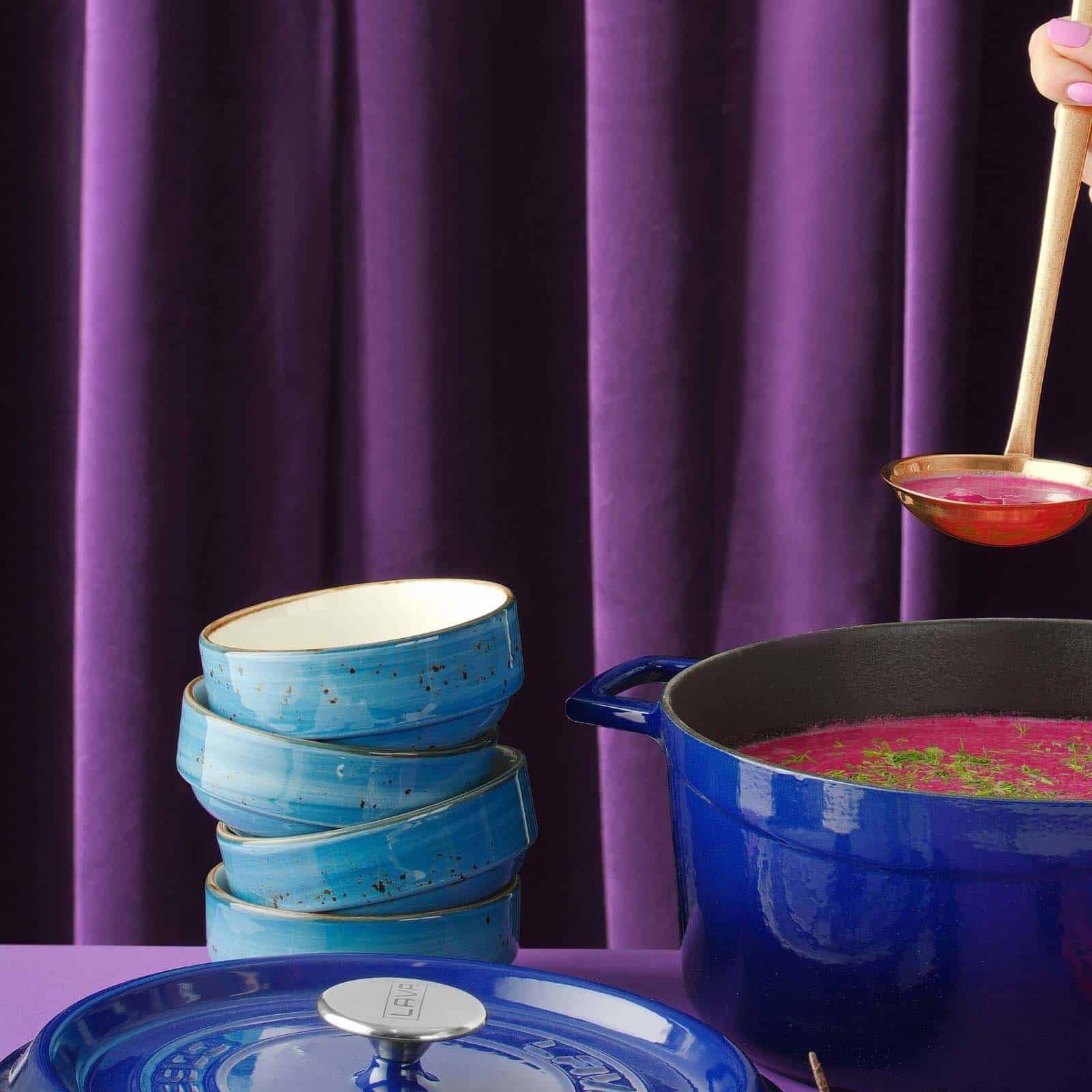 Colecție bogată de porțelan decorat manual, disponibilă în patru culori vibrante. Combină elemente portocalii, albastre, bleumarin și gri pentru un aspect unic și surprinzător al mesei, iar preparatele vor arăta la fel de bine pe cât sunt de gustoase. Vesela este durabilă și rezistentă, proiectată special pentru a face față utilizării intense în bucătăriile profesionale.