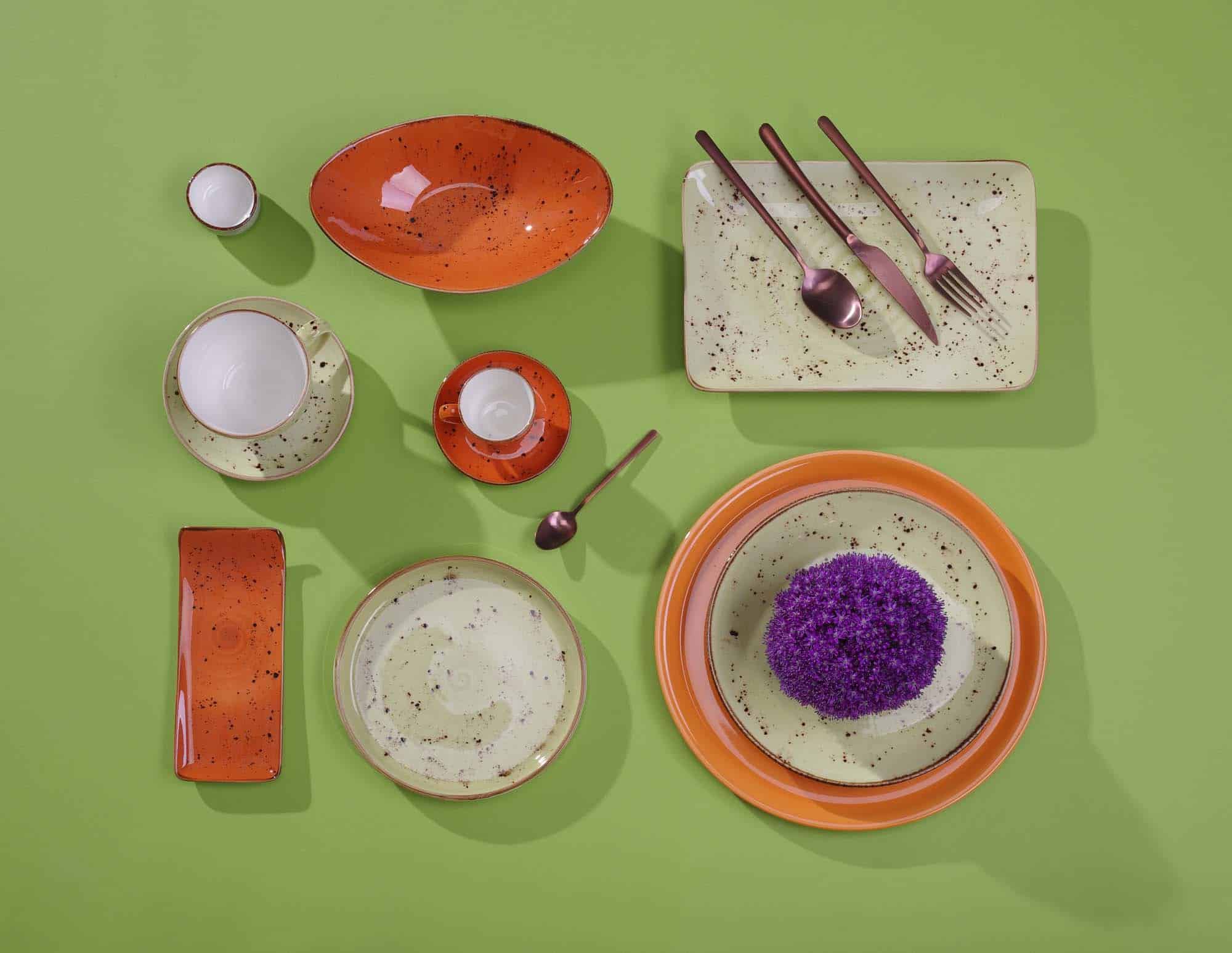 Colecție bogată de porțelan decorat manual, disponibilă în patru culori vibrante. Combinați elemente portocalii, albastre, bleumarin și gri pentru un aspect unic și surprinzător al mesei, iar preparatele vor arăta la fel de bine pe cât sunt de gustoase. Vesela este durabilă și rezistentă, concepută special pentru utilizare intensivă în bucătăriile profesionale.