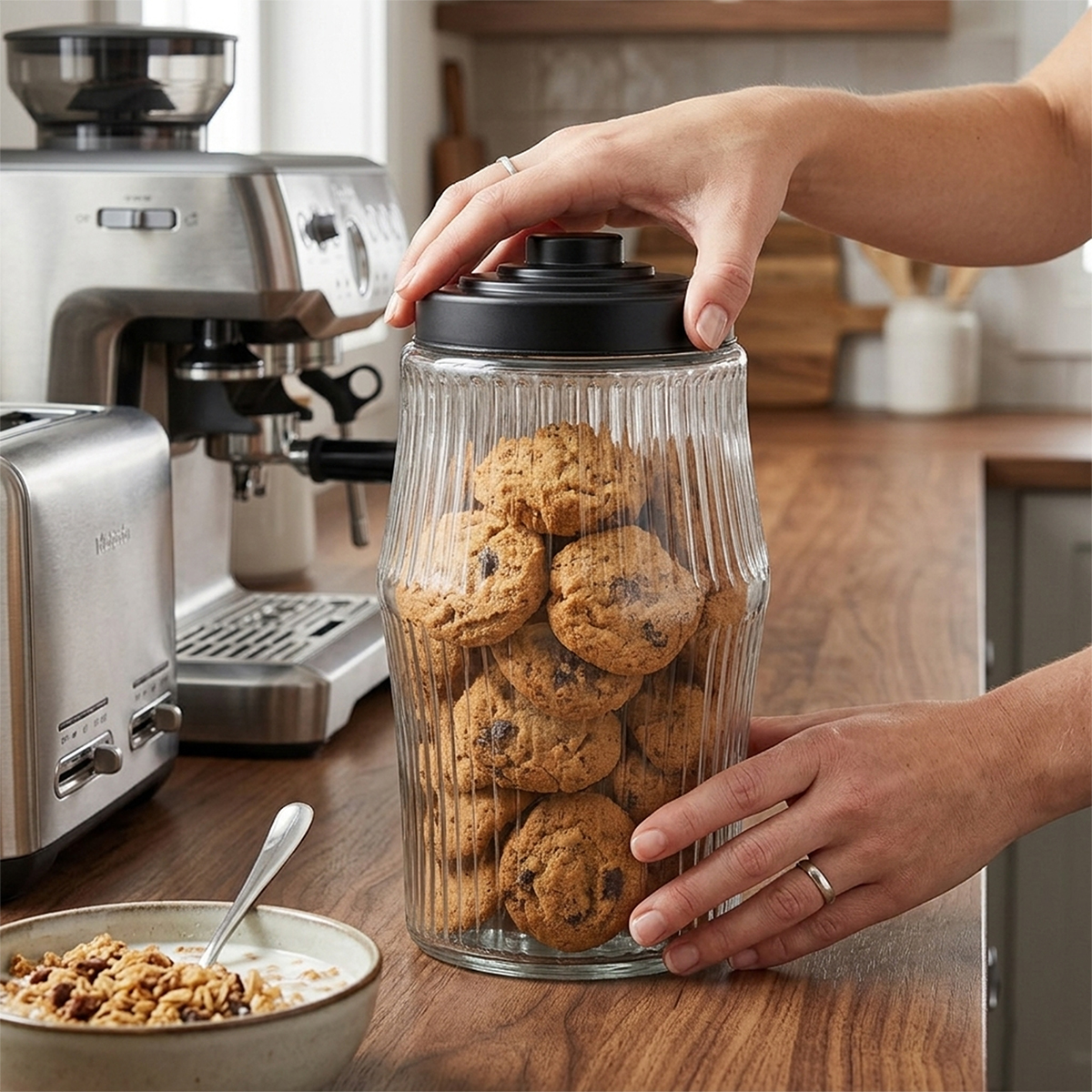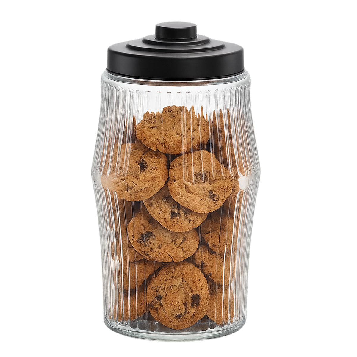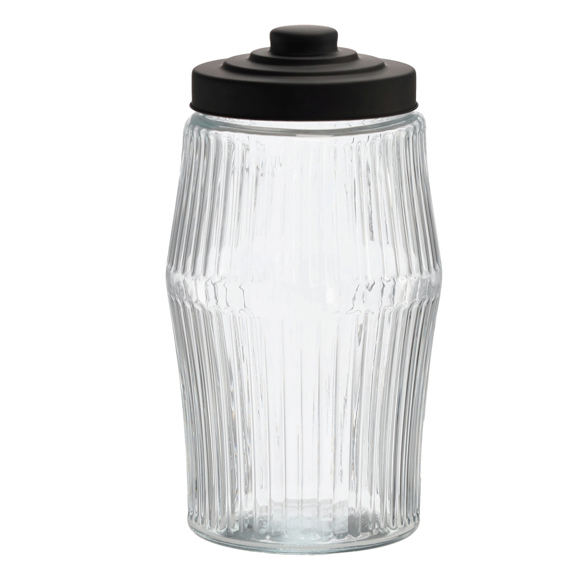 Borcanul din sticlă pentru alimente cu capac – 3,8 L este un accesoriu elegant pentru orice bucătărie profesională sau casnică. Cu o capacitate de 3,8 l și un design cu nervuri moderne, este ideal pentru depozitarea pastelor, orezului, făinii, leguminoaselor, nucilor și altor ingrediente. Capacul metalic negru oferă un aspect modern și protejează conținutul în timpul depozitării.