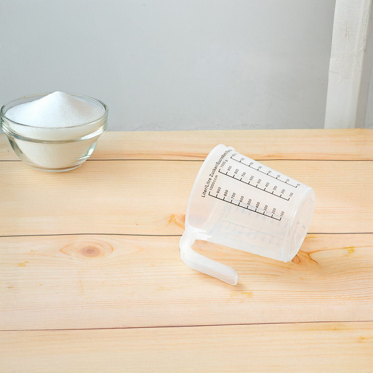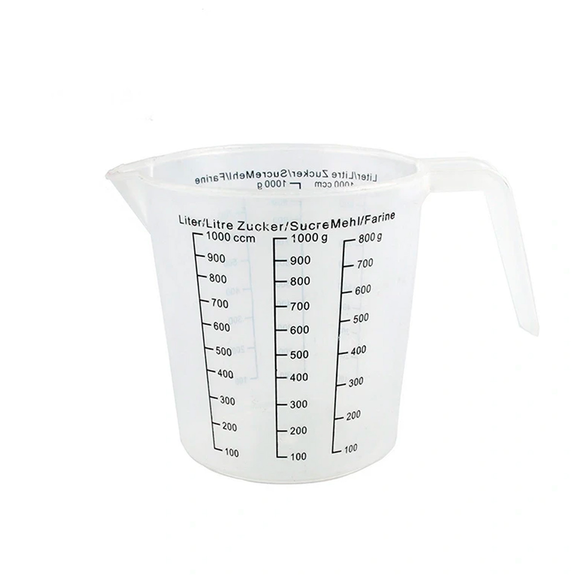 - Transparentă, cu scară gradată precisă pentru lichide, zahăr și făină