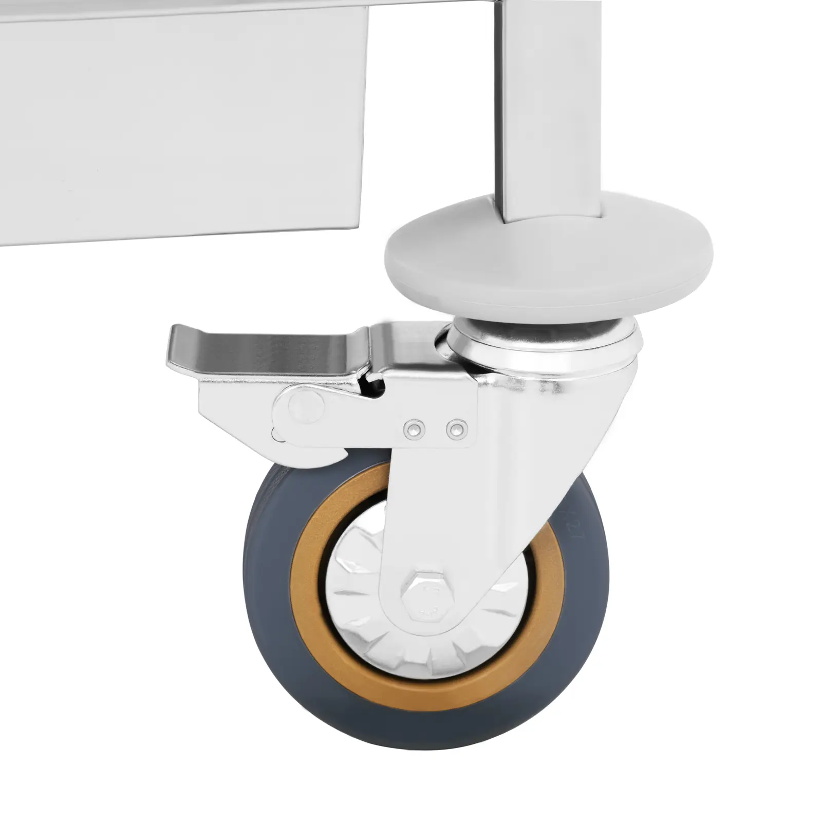 - 4 roți din cauciuc plin, cu rulmenți cu bile și frâne de blocare