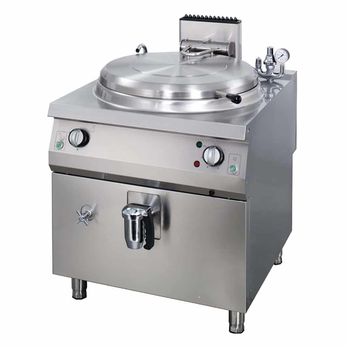 Cazanul de gătit Premium cu volum de 150 l este ideal pentru fierbere, coacere sau poșare. Vasul de gătit are un capac dublu perete, care asigură o izolație superioară. Capacul se deschide și se închide ușor datorită mecanismului rabatabil și echilibrat. Acest cazan de gătit are sistem de încălzire directă; vasul cu perete simplu are sursa de căldură direct sub vas. Deoarece este fabricat complet din inox, curățarea este foarte ușoară.