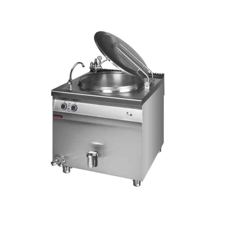 Cazanul electric de gătit 900.BEK-200 cu încălzire indirectă este ideal pentru prepararea unor cantități mari de produse. Sistem automat de control al presiunii în manta, reglare continuă a puterii, robinet de golire de 1,5 inch. Comutatoare și regulatoare de putere E.G.O.