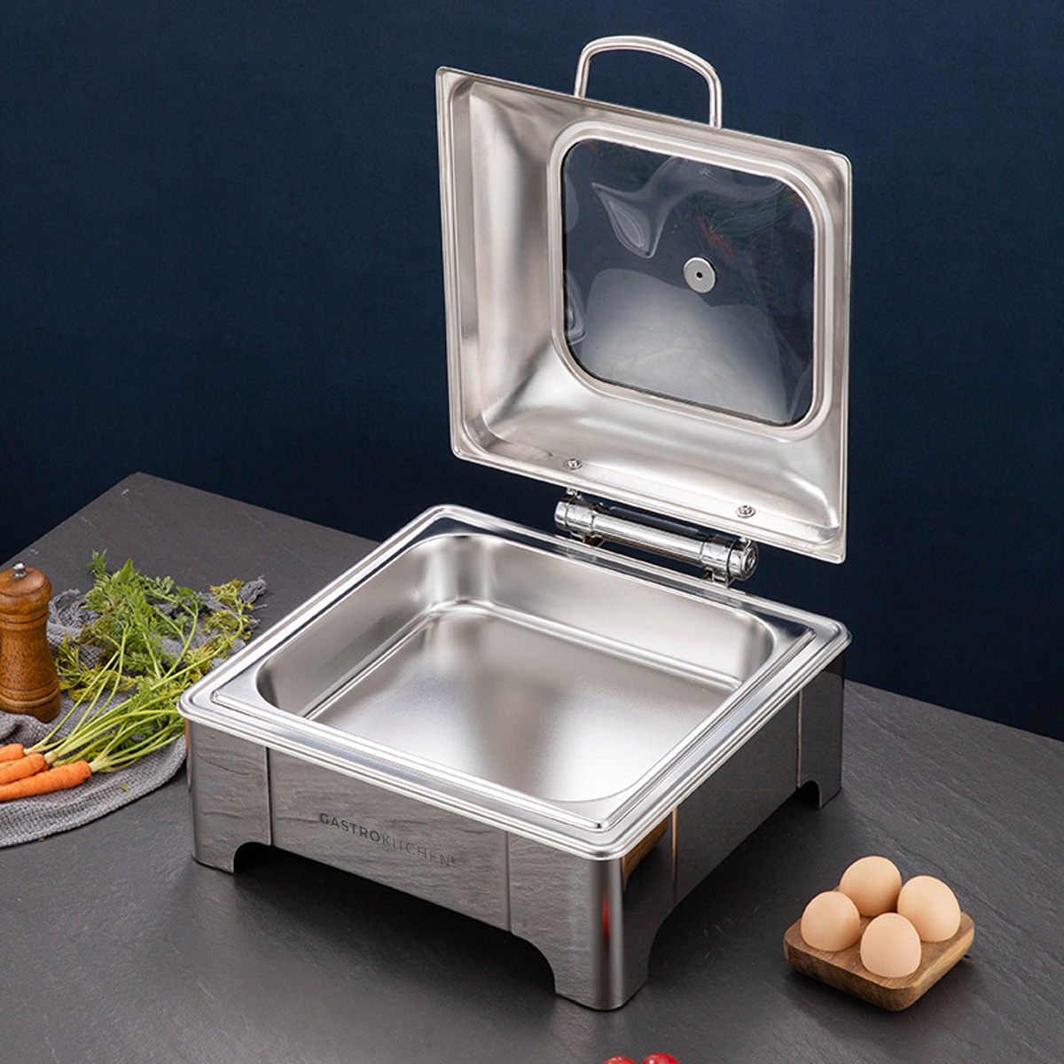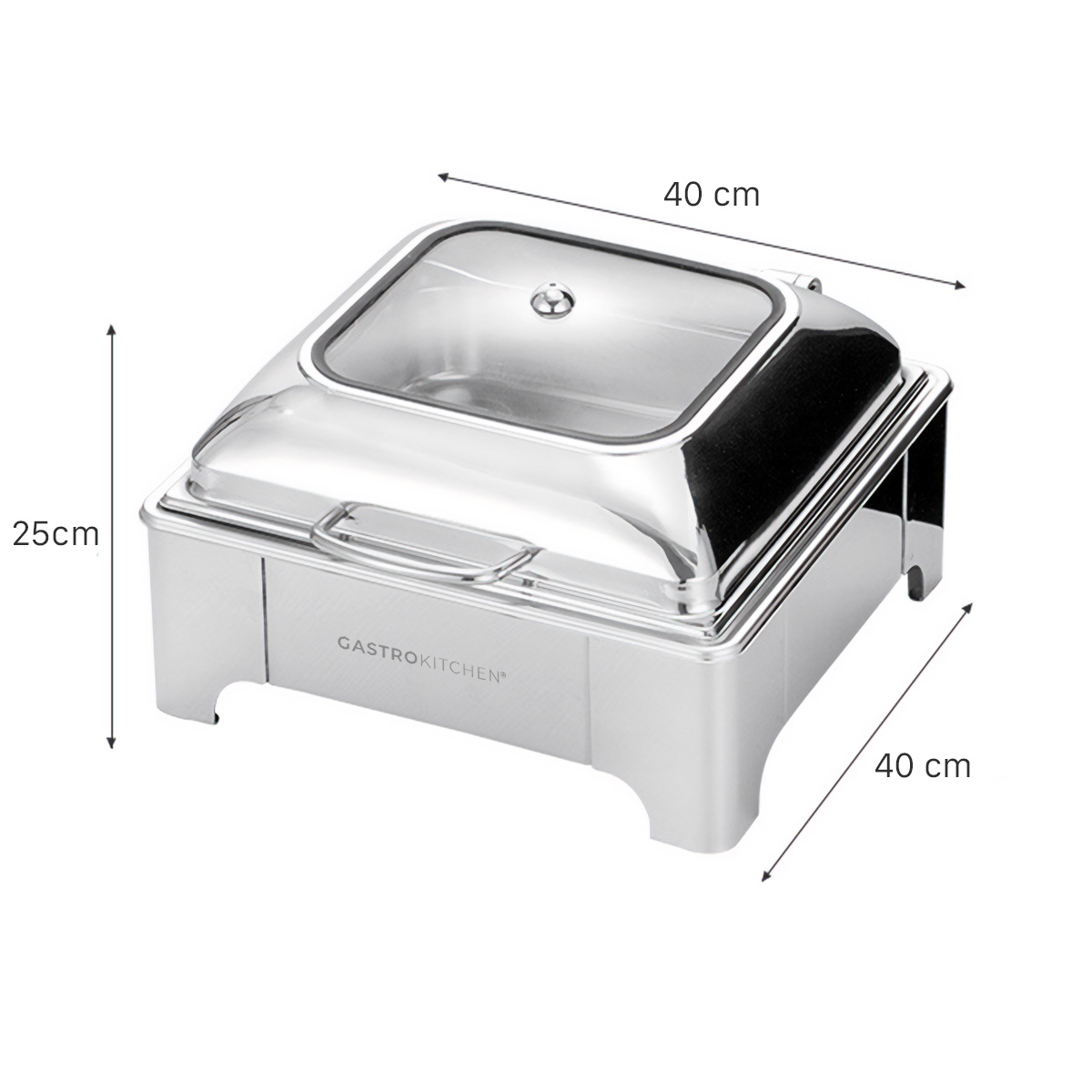 Datorită dimensiunilor de 40 × 40 × 25 cm și a tăvii GN 2/3 (inclusă în pachet), oferă suficient spațiu pentru servirea felurilor principale, garniturilor sau legumelor. Sistemul de încălzire este alimentat electric (230 V), cu putere reglabilă până la 700 W și permite setarea temperaturii între 45 și 225 °C. În caz de supraîncălzire, chafingul este dotat cu termostat de siguranță care oprește aparatul la depășirea a 230 °C. Încălzitorul este detașabil și ușor de înlocuit.