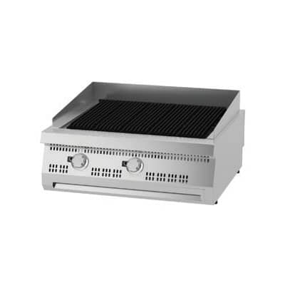 Chargrill-ul Premium funcționează pe gaz și, spre deosebire de plitele clasice de grătar, încălzește spațiul de sub suprafața de gătit. Sub grătarul superior înclinat se află grătare din fontă care distribuie uniform căldura și asigură colectarea grăsimii într-o tavă de scurgere sub zona de gătit. Chargrill-ul este echipat cu un paravan înalt anti-stropire din inox, care previne stropirea cu ulei. Împreună cu designul ergonomic al panoului de control, acest lucru asigură o utilizare confortabilă și sigură. Întregul grătar este realizat din inox și se curăță ușor. Datorită adâncimii de 900 mm, grătarul poate găti simultan o cantitate mare de alimente.