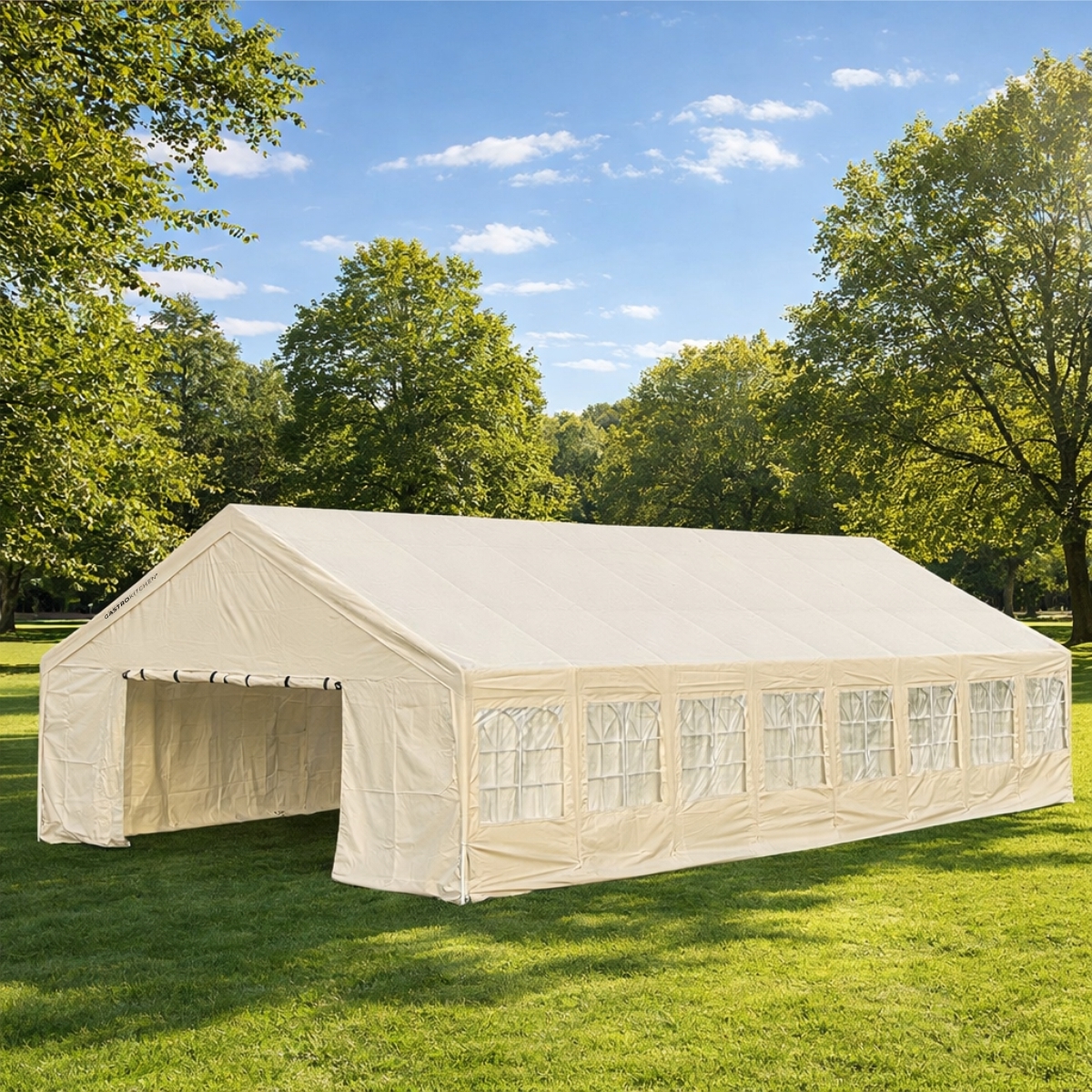 Cort profesional de petrecere 6×12 m (72 m²) cu o capacitate de până la 140 persoane în picioare, 100 persoane pe scaune sau 94 invitați la seturi de mese tip bancă. Soluție ideală pentru nunți, festivaluri, evenimente corporate de catering sau ca adăpost temporar pentru depozitare. Structura din oțel vopsit alb Ø 38 mm / conectori Ø 42 mm asigură stabilitate excelentă chiar și în condiții meteo dificile.