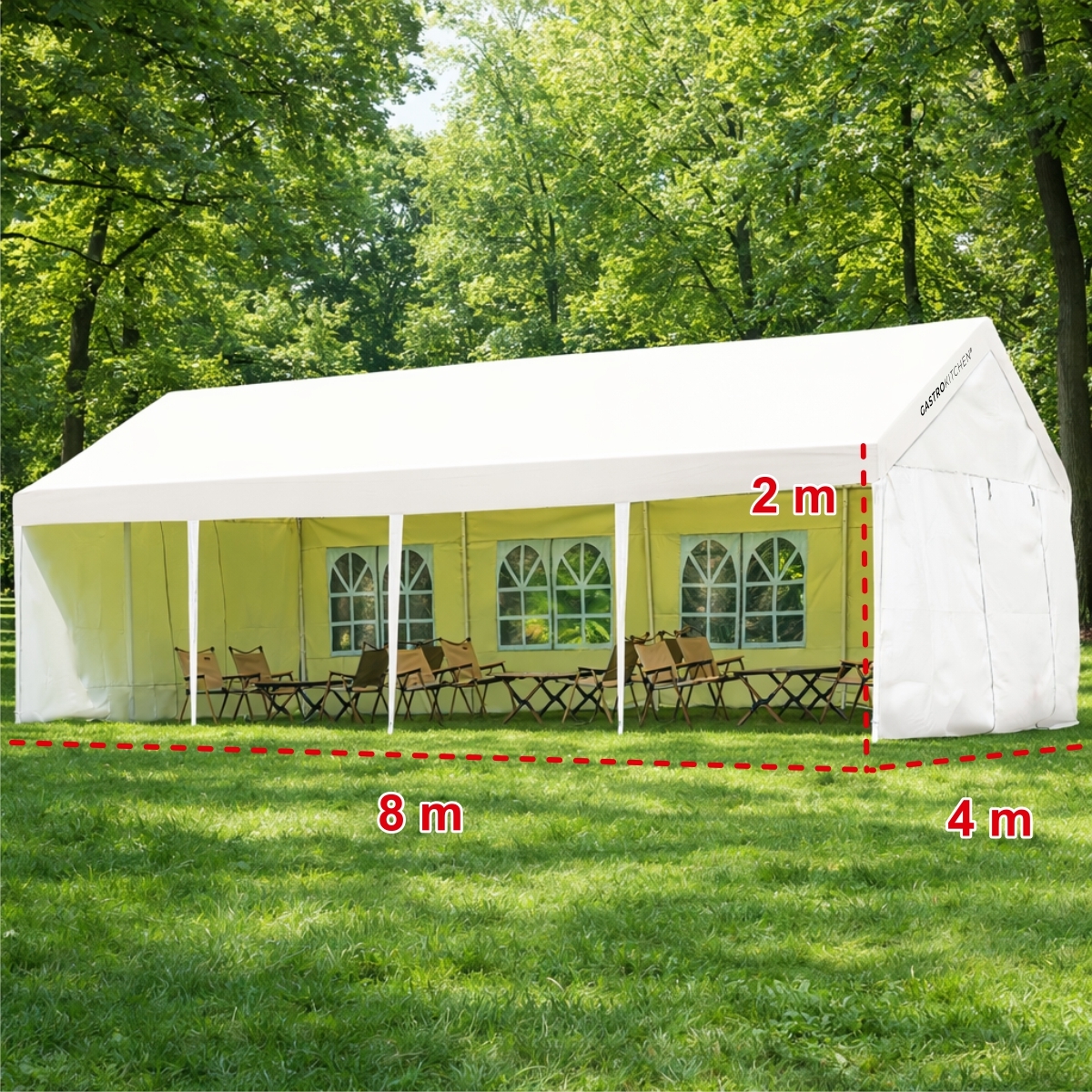 Cort profesional pentru petreceri 4 × 8 m (32 m²) cu o capacitate de până la 60 persoane în picioare, 44 persoane așezate pe scaune sau 38 invitați la seturi de mese tip bancă. Soluție ideală pentru nunți, festivaluri, evenimente corporate de catering sau ca adăpost temporar pentru depozitare. Structura din oțel vopsit alb (galvanizat) Ø 38 mm / conectori Ø 42 mm oferă stabilitate excelentă chiar și în condiții meteo dificile.