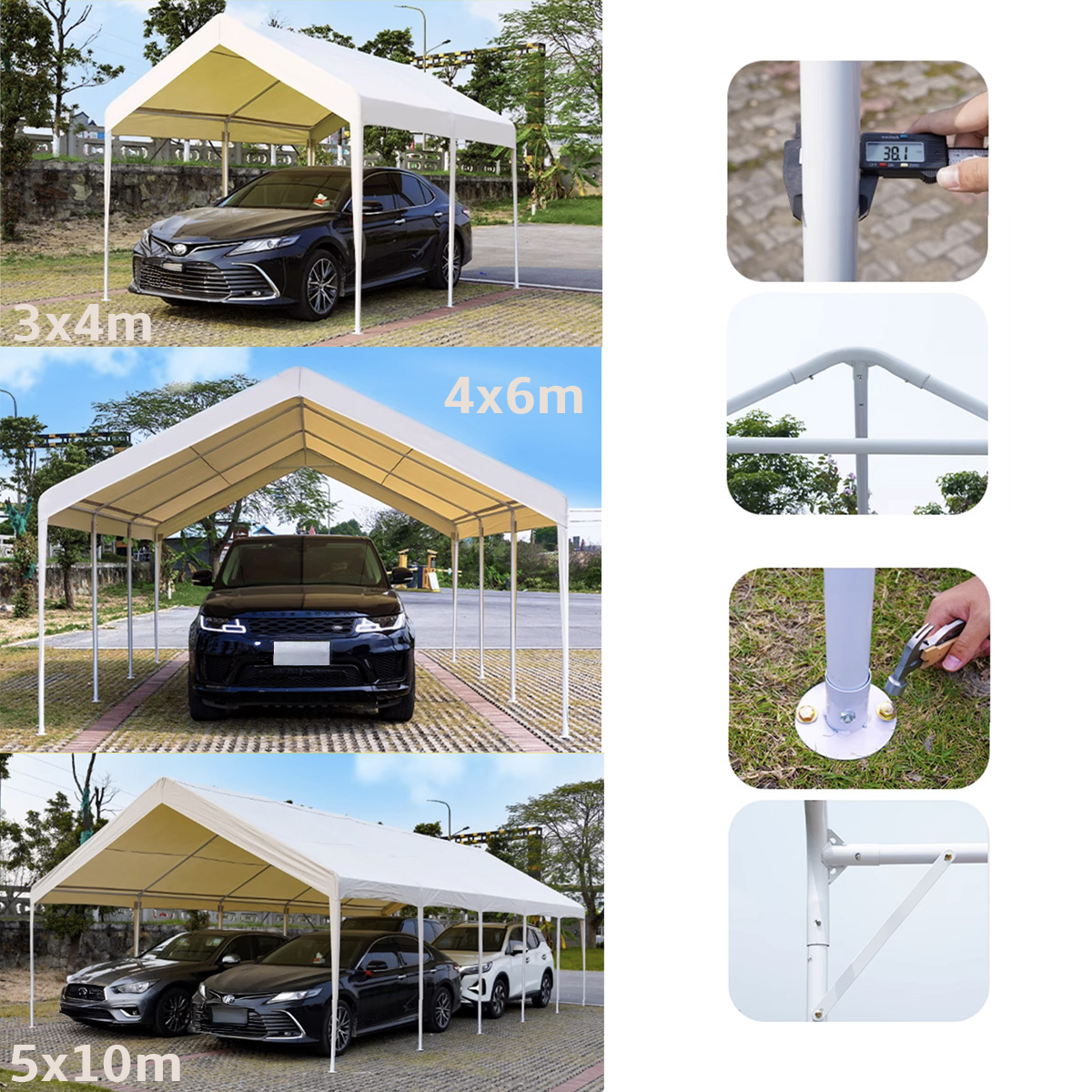 Structură din oțel vopsit alb (galvanizat) Ø 38 mm / conectori Ø 42 mm oferă stabilitate excelentă chiar și în condiții meteo dificile.