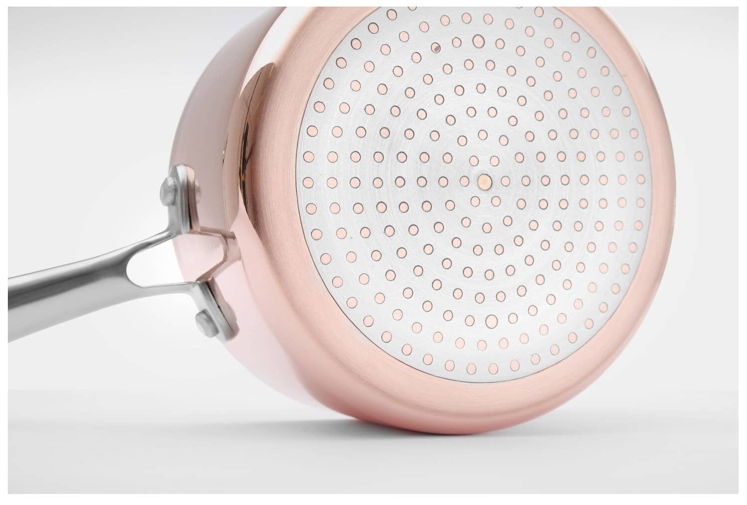 - Construcție triplă, grosime 2,5 mm, compusă din inox (0,4 mm), aluminiu (1,5 mm) și cupru (0,4 mm).
