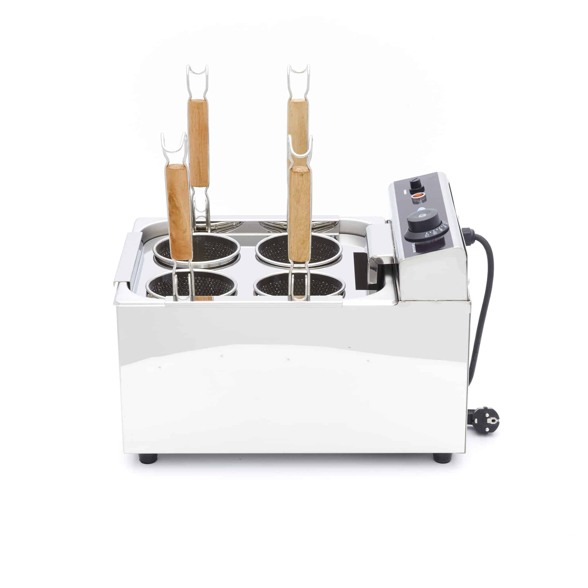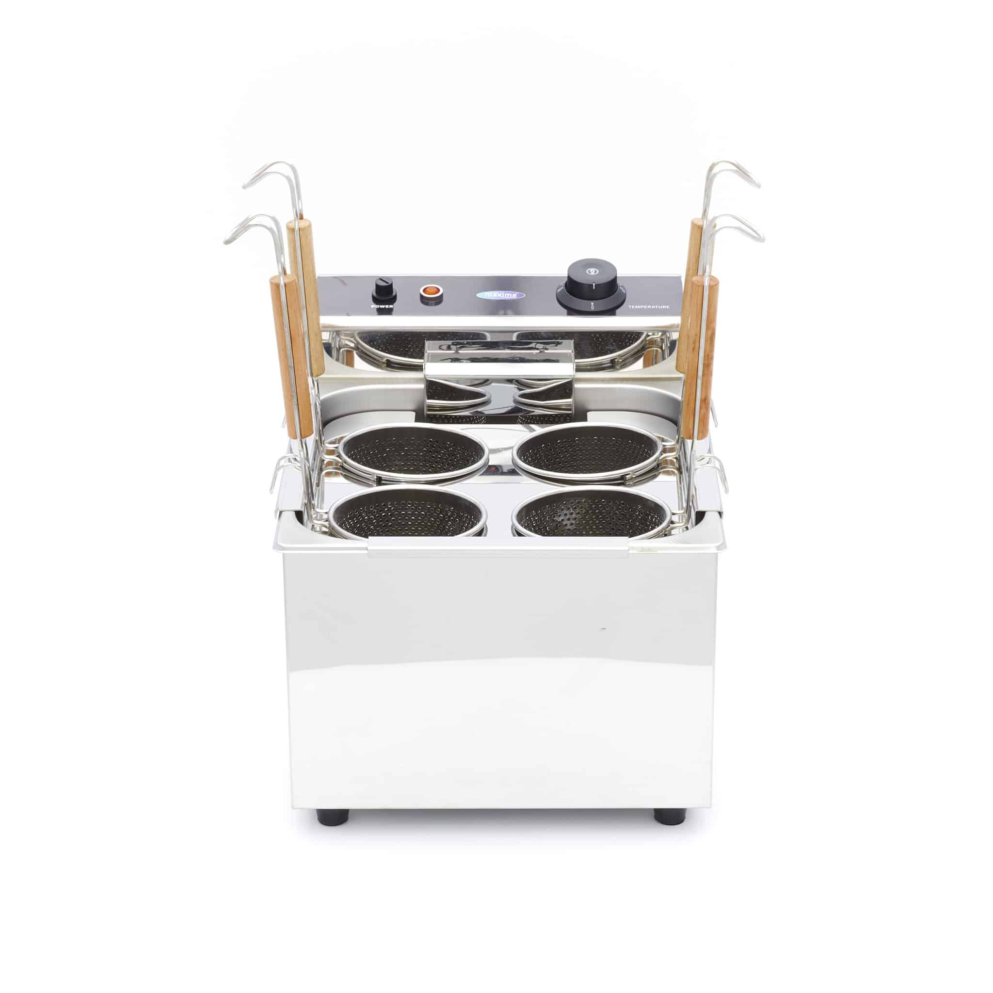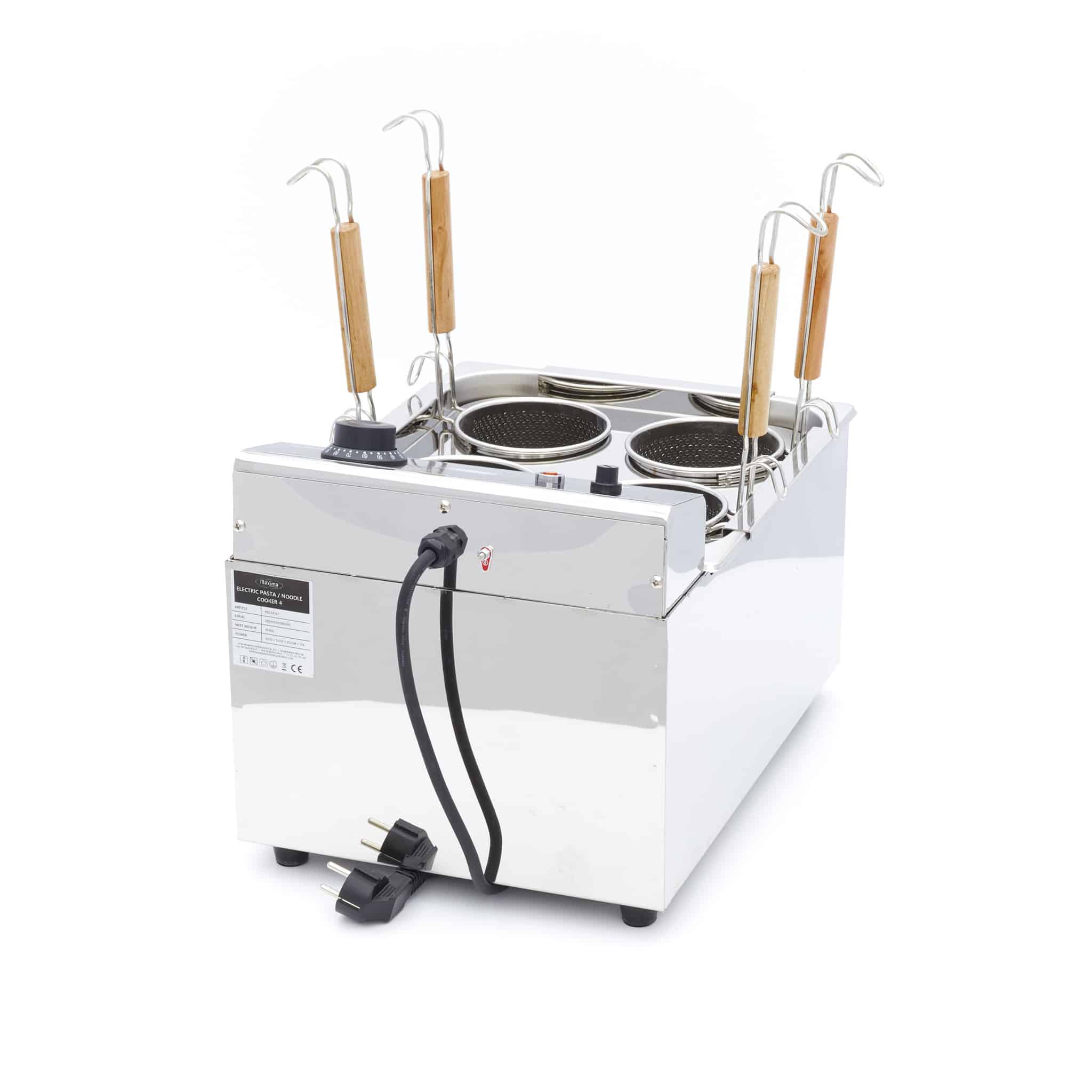 Cu acest cuptor profesional pentru paste/noodles puteți prepara rapid paste și tăiței delicioși. Umpleți cuva spațioasă cu apă și încălziți apa la temperatura dorită. Apoi adăugați pastele în cele 4 coșuri din inox. Aparatul pentru paste/noodles este prevăzut cu suport pentru coșuri, astfel încât acestea să stea suspendate deasupra apei. Carcasa din inox asigură o curățare ușoară a cuptorului pentru paste.