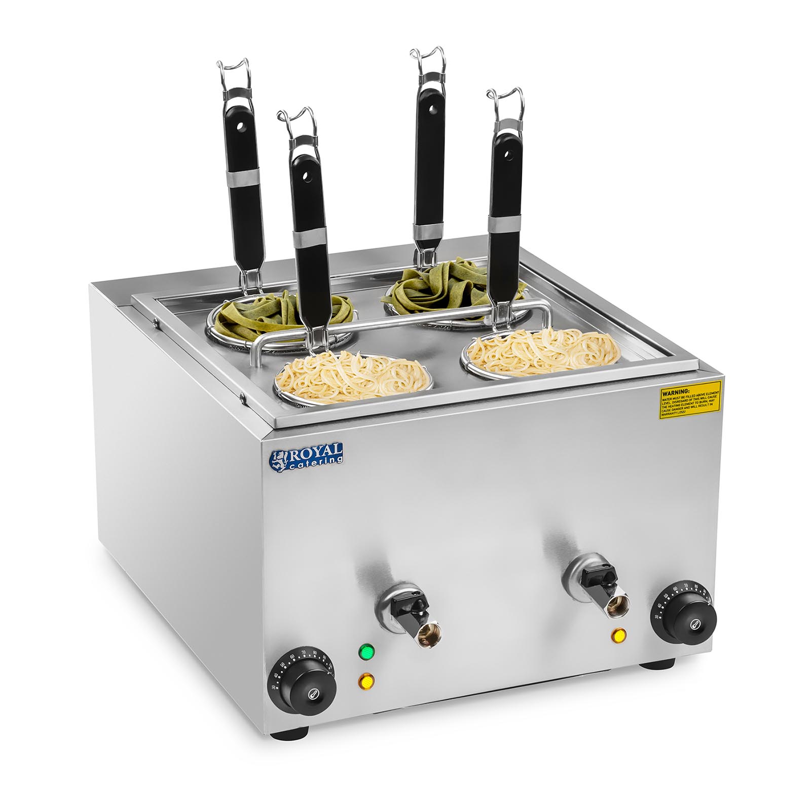 Cuptorul electric pentru paste RCNK-4 de la Royal Catering este proiectat pentru uz profesional în fast-food-uri, restaurante și unități de catering de orice tip. Datorită celor patru coșuri și puterii totale de 3000 wați, este ideal pentru prepararea rapidă și simultană a până la 4 tipuri de paste. Temperatura poate fi reglată individual cu ajutorul termostatului. Coșurile cu plasă deasă permit gătirea profesională a tuturor tipurilor de paste, legume sau alte specialități. Robinetul de scurgere pentru apă vă economisește timp atât la prepararea alimentelor, cât și la golirea rezervorului de apă.