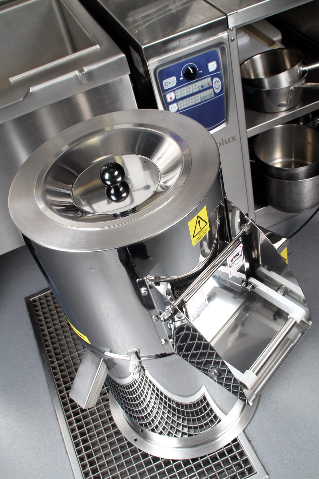 Curățător de cartofi – capacitate 20 kg | ȘKBZ-20N este destinat pentru curățarea cartofilor și a legumelor rădăcinoase în bucătării școlare, hoteluri și restaurante. Curățarea se realizează prin frecarea cartofilor sau a legumelor de peretele interior al tamburului și de suprafața superioară a discului rotativ, pe care este aplicat un strat abraziv de corindon. Mișcarea cartofilor în tambur este asigurată de discul rotativ care formează baza tamburului.