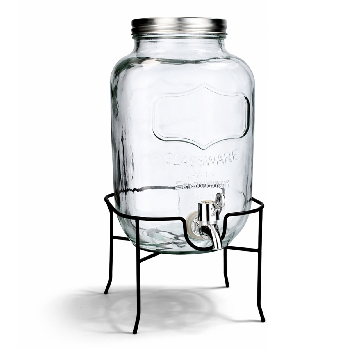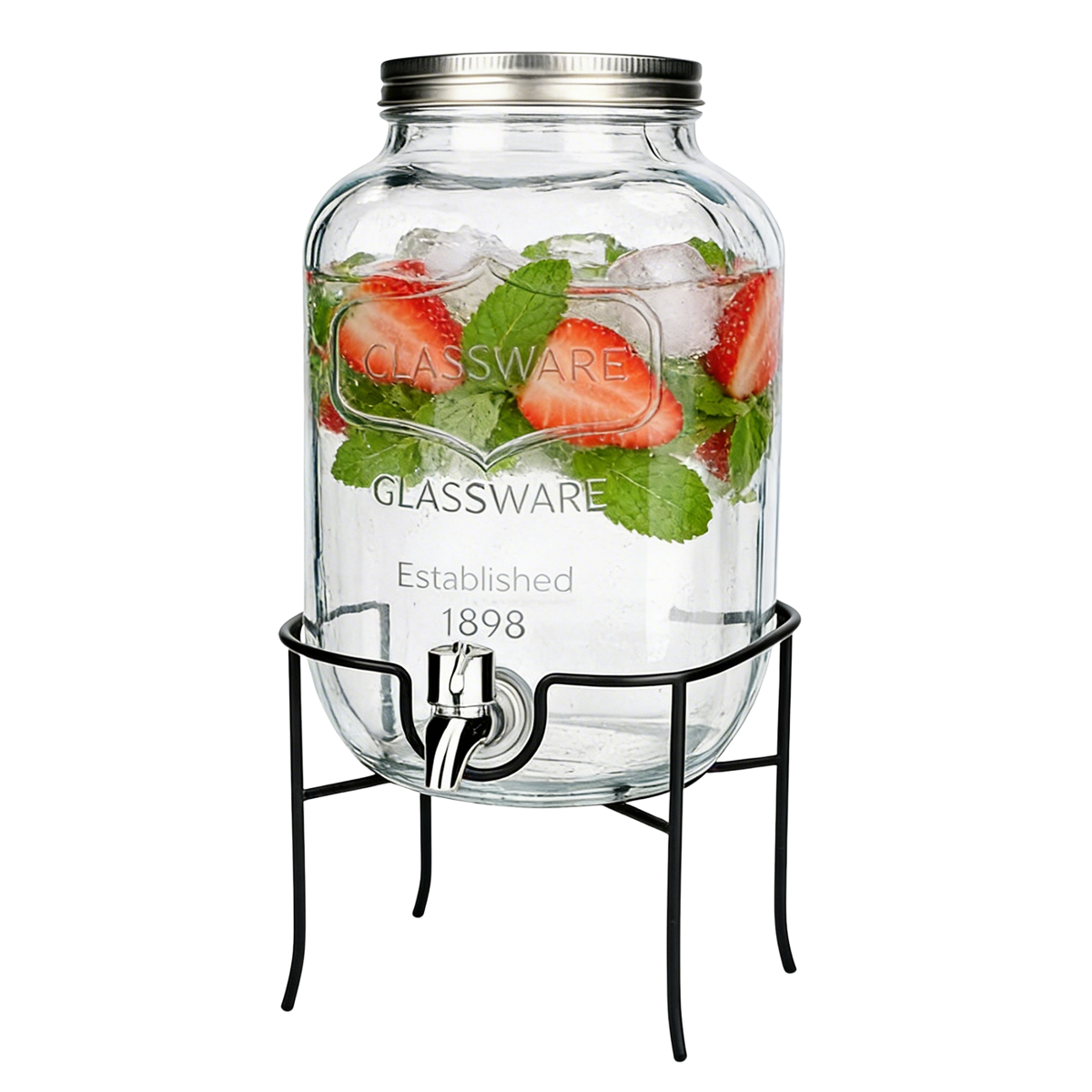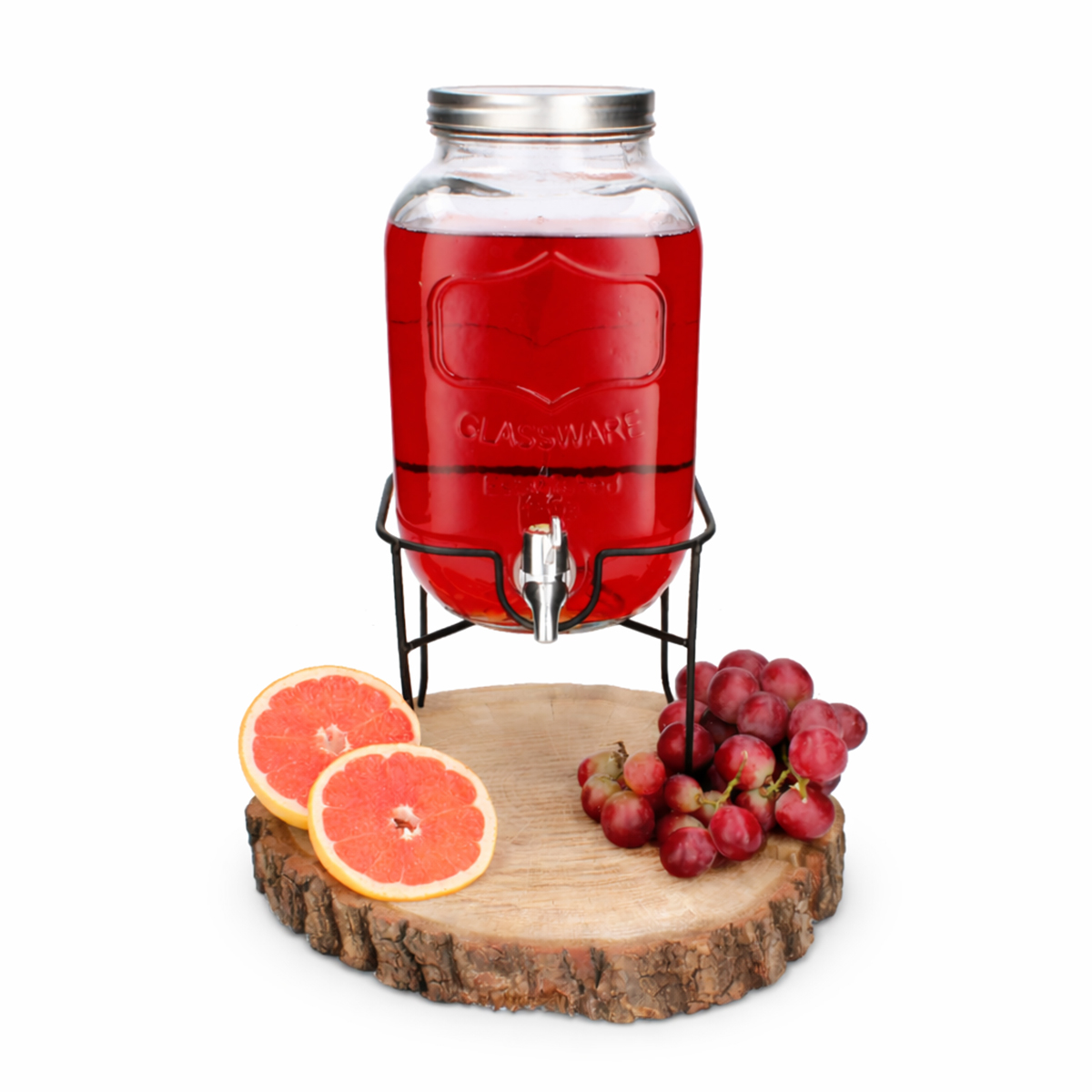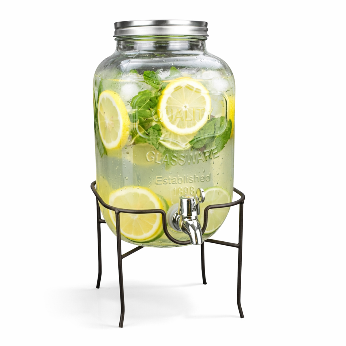 Dozatorul de băuturi cu suport și robinet – 4 L este un recipient practic din sticlă, ideal pentru servirea elegantă a limonadei, sucurilor, apei sau altor băuturi. Datorită suportului metalic și robinetului, dozarea băuturilor este simplă și igienică.