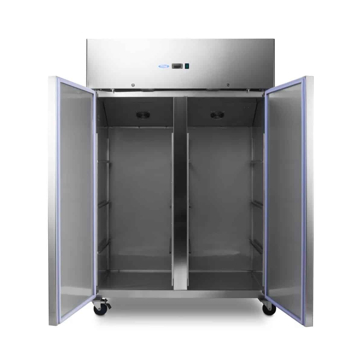 În bucătăriile profesionale mari, acest frigider performant cu două uși este un real avantaj. Adesea, când este agitație în bucătărie, angajații pot uita să închidă corect ușile frigiderului, ceea ce duce la variații de temperatură. Datorită ușilor cu închidere automată ale acestui frigider, această grijă dispare. Frigiderul are o capacitate de 1200 litri și este echipat cu șase rafturi reglabile, potrivite pentru tăvi GN 2/1. De asemenea, frigiderul este prevăzut cu încuietoare și vine cu două chei, precum și cu iluminare LED integrată.