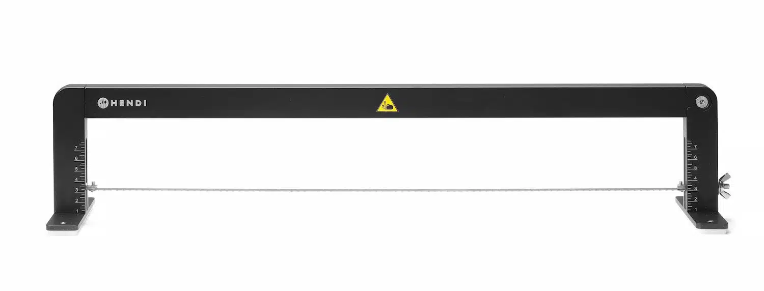 Fierăstrăul pentru blat de tort – 620x120x(H)130 mm | Hendi 400098 este un produs fiabil, precis, igienic și foarte rezistent, ideal pentru tăierea longitudinală corectă și uniformă a straturilor de pandișpan. Acest cuțit pentru blat este destinat atât profesioniștilor din cofetării, cât și bucătarilor mai puțin experimentați, fiind foarte ușor de folosit și de curățat.