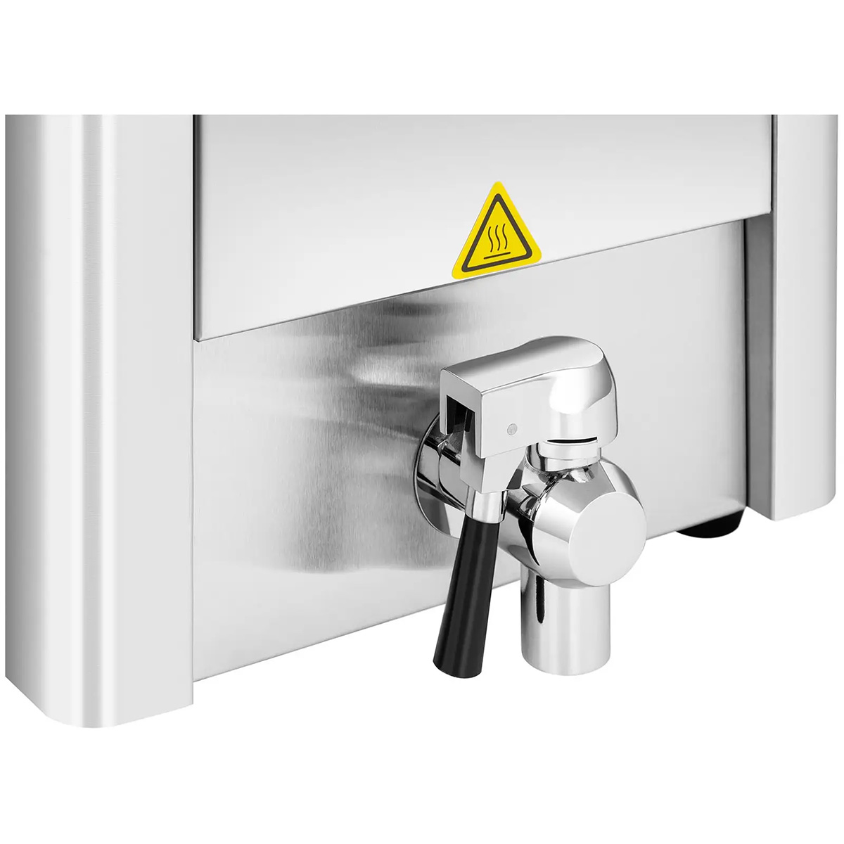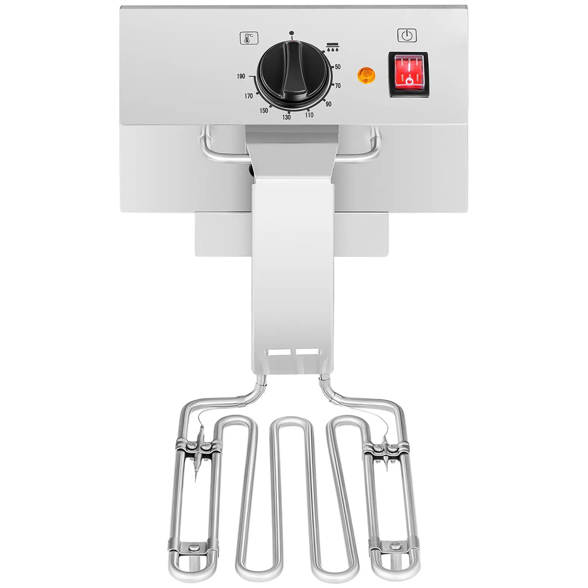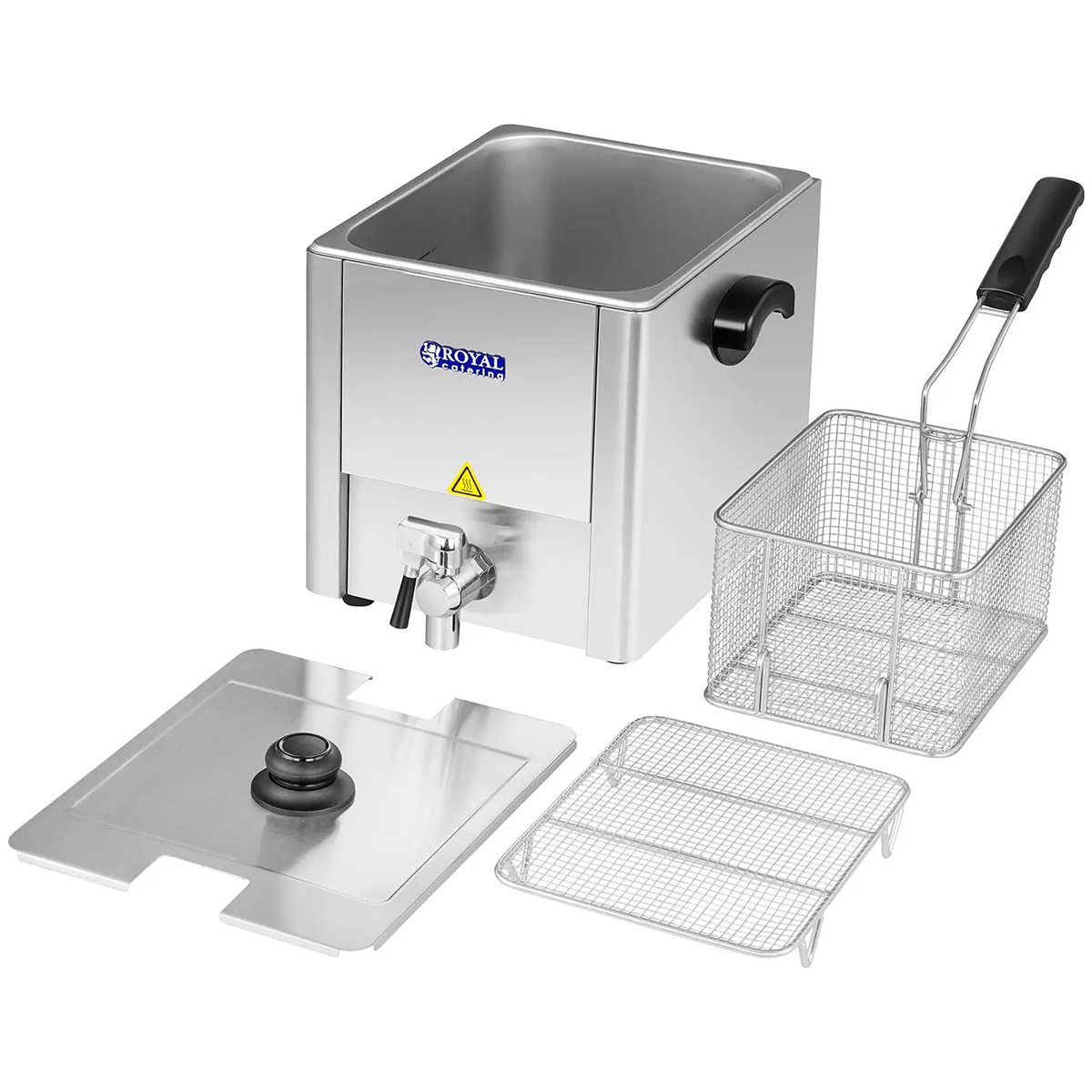 Friteuza RCEF13E-EGO cu o capacitate de 13 litri de la producătorul Royal Catering este destinată utilizării profesionale în unități gastronomice. Este fabricată din oțel inoxidabil de înaltă calitate, ceea ce îi oferă protecție eficientă împotriva coroziunii. Friteuza este echipată cu un termostat modern de la brandul german E.G.O. Termostatele E.G.O. sunt printre cele mai avansate și fiabile de pe piață. Elementul de încălzire performant funcționează la o putere de 3250 W. Temperatura setată prin termostat este menținută datorită controlului automat al temperaturii. Friteuza dispune, de asemenea, de un robinet profesional de scurgere cu filtru. Producătorul a proiectat cuvele cu margini rotunjite pentru a facilita curățarea. Stabilitatea și siguranța sunt asigurate de picioarele din cauciuc antiderapante. Pentru a preveni arderea resturilor care cad din coșul de prăjire, friteuza este prevăzută în partea de jos cu zone reci speciale.