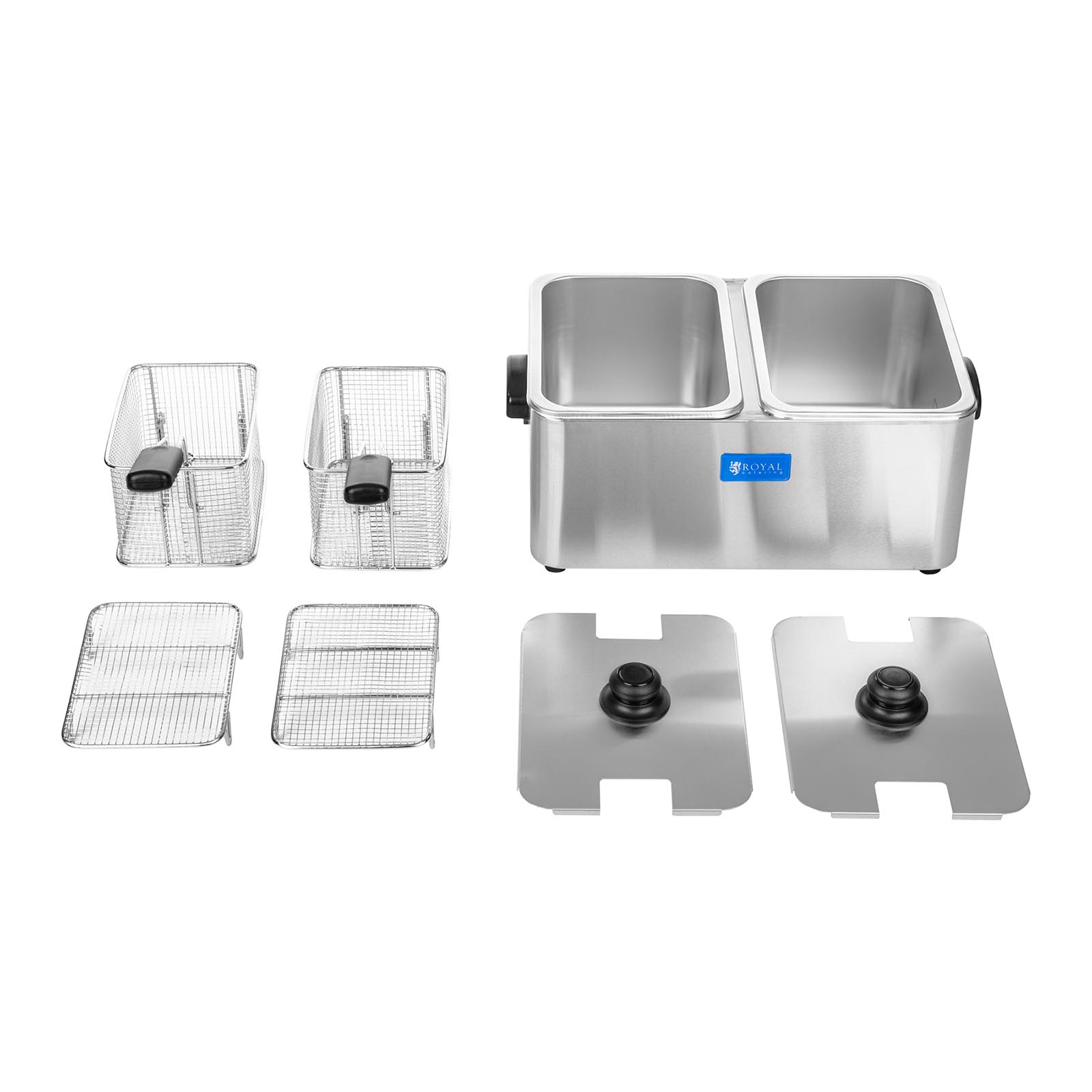 Friteuza dublă RCEF 08D-EGO cu o capacitate de 2 x 8 litri de la producătorul Royal Catering este destinată utilizării profesionale în unități gastronomice. Este fabricată din oțel inoxidabil de înaltă calitate, ceea ce îi oferă o protecție eficientă împotriva coroziunii. Această friteuză este echipată cu un termostat modern de la brandul german E.G.O. Termostatele E.G.O. sunt printre cele mai avansate și fiabile de pe piață. Elementul de încălzire performant al friteuzei funcționează cu o putere de 2500 W. Temperatura setată prin termostat este menținută datorită controlului automat al temperaturii. Un alt avantaj al friteuzei este rezervorul detașabil. Producătorul a proiectat rezervoarele cu colțuri rotunjite pentru a facilita curățarea. O altă caracteristică importantă este flexibilitatea friteuzei. Stabilitatea este asigurată de picioarele din cauciuc antiderapante. Zonele reci speciale din partea de jos a friteuzei previn arderea resturilor alimentare.