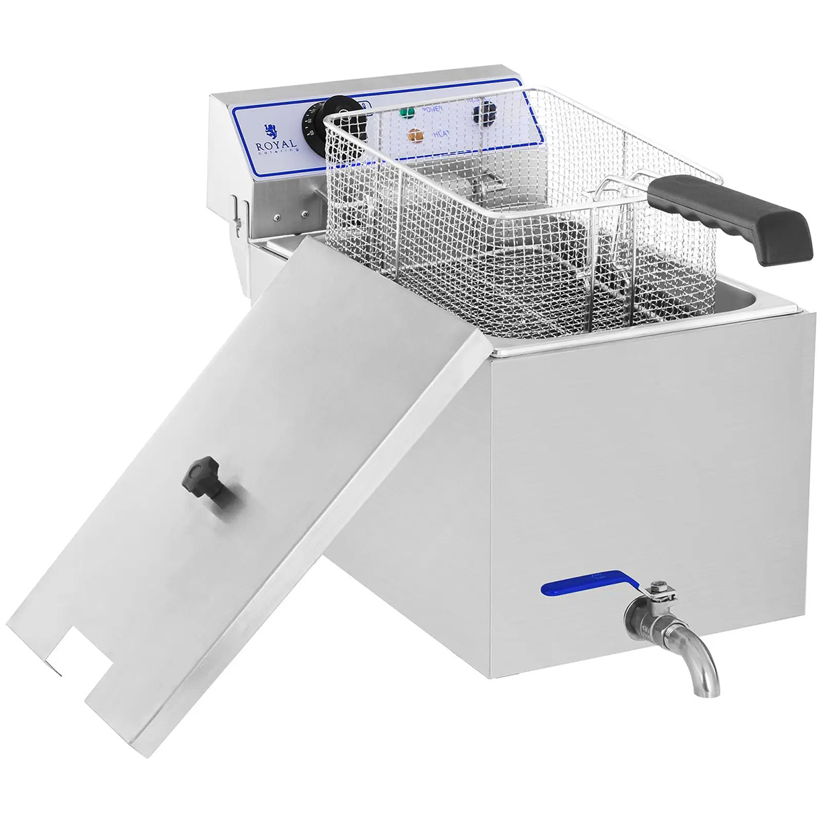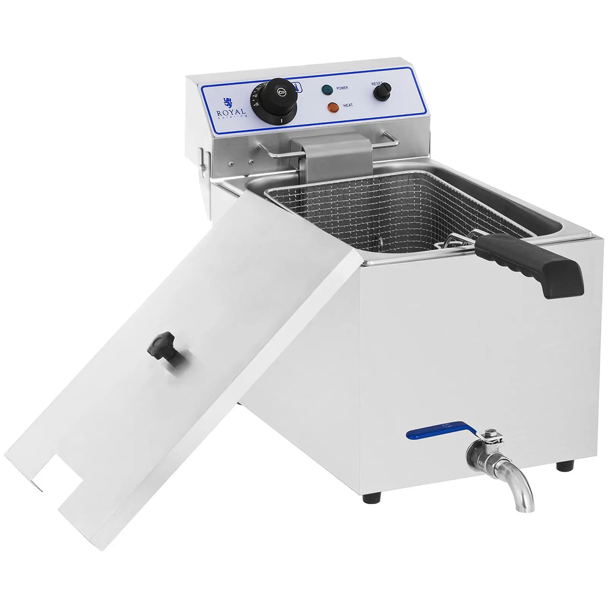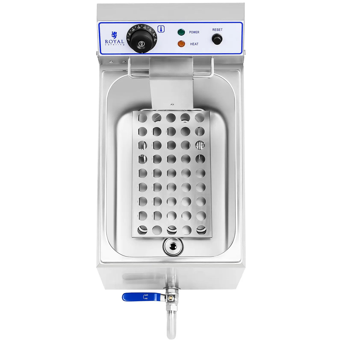 Friteuza electrică RCEF 15E de la Royal Catering este concepută pentru prepararea rapidă și comodă a diferitelor tipuri de alimente. Este destinată utilizării profesionale și este ideală pentru gătirea unor cantități mari de mâncare la evenimente în hoteluri. De asemenea, este perfectă pentru standuri de fast-food la festivaluri sau târguri.