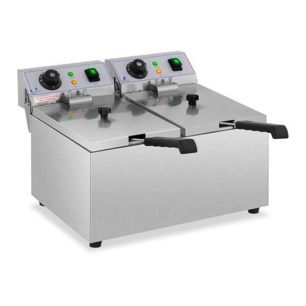Friteuza dispune de două cuve de 8 litri, fiecare putând fi umplută cu până la 4 litri de ulei. Astfel, puteți prăji cantități mari simultan. Este extrem de versatilă în domeniul HoReCa, potrivită pentru prepararea aripioarelor de pui, cartofilor prăjiți, fructelor de mare, peștelui, legumelor și multor alte gustări prăjite. Cuvele pot fi folosite independent, astfel încât puteți găti diferite preparate în același timp.