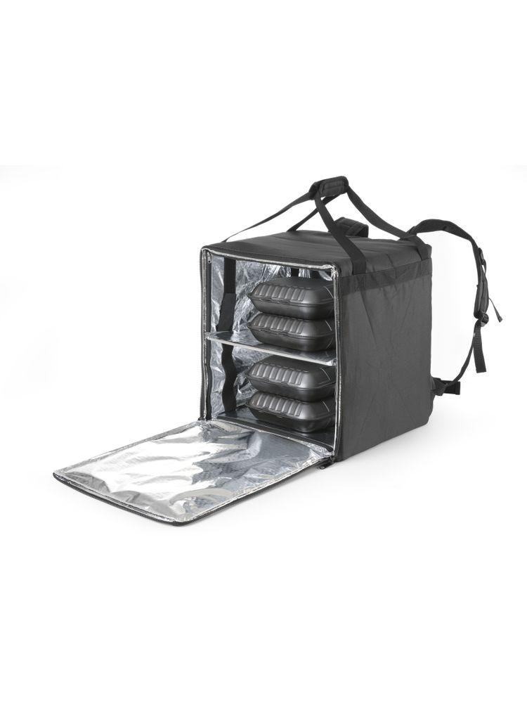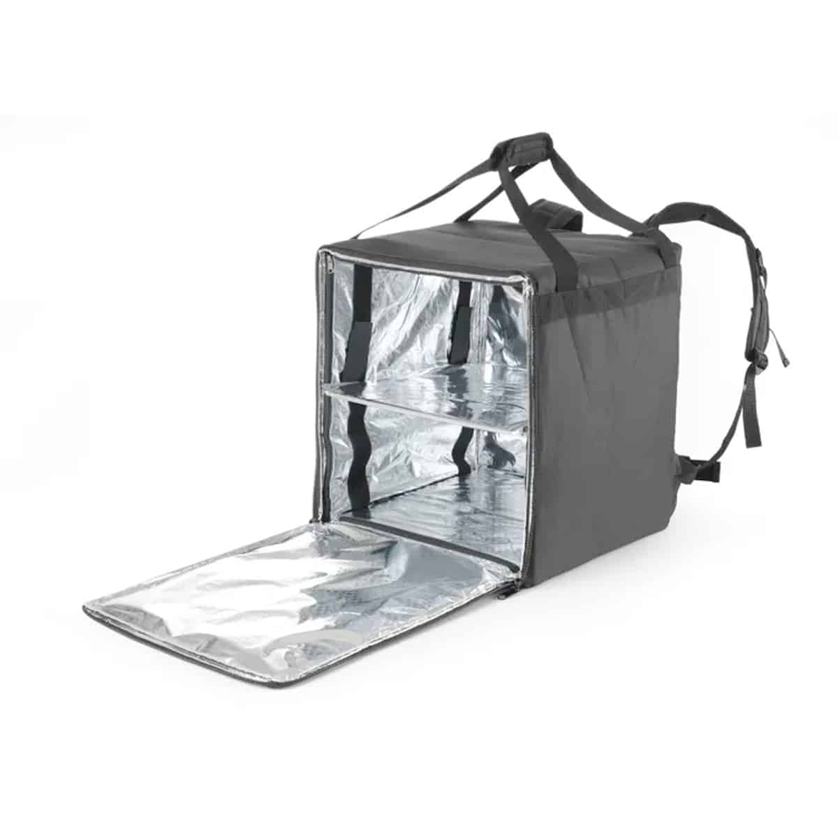 - Izolație și capacitate – rucsacul are un compartiment foarte mare, în care încap până la 10 cutii de pizza. Datorită celor două straturi de izolație, preparatele își păstrează temperatura optimă pe durata transportului, chiar și în condiții meteo nefavorabile. Accesul la conținut se face printr-un perete cu fermoar rezistent.