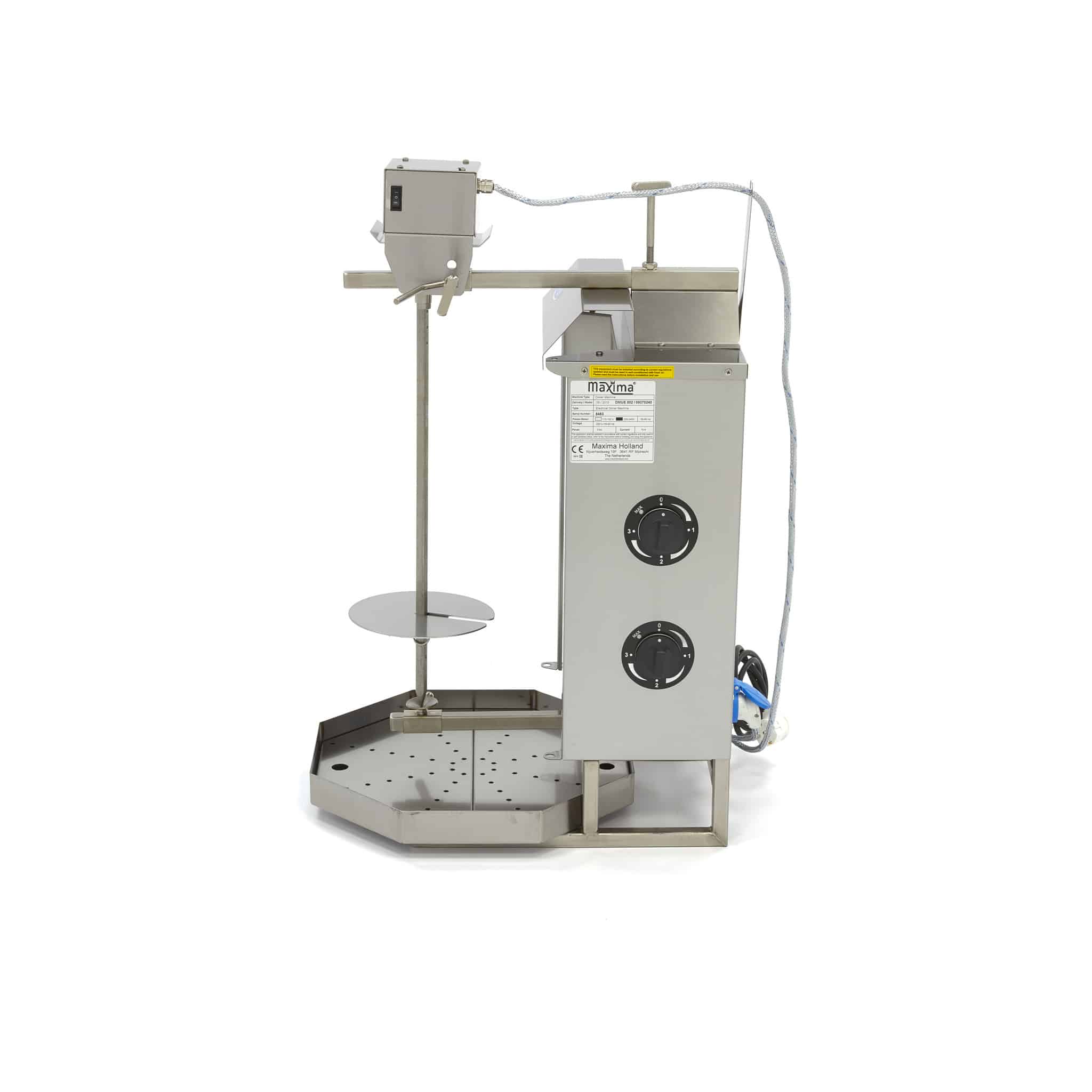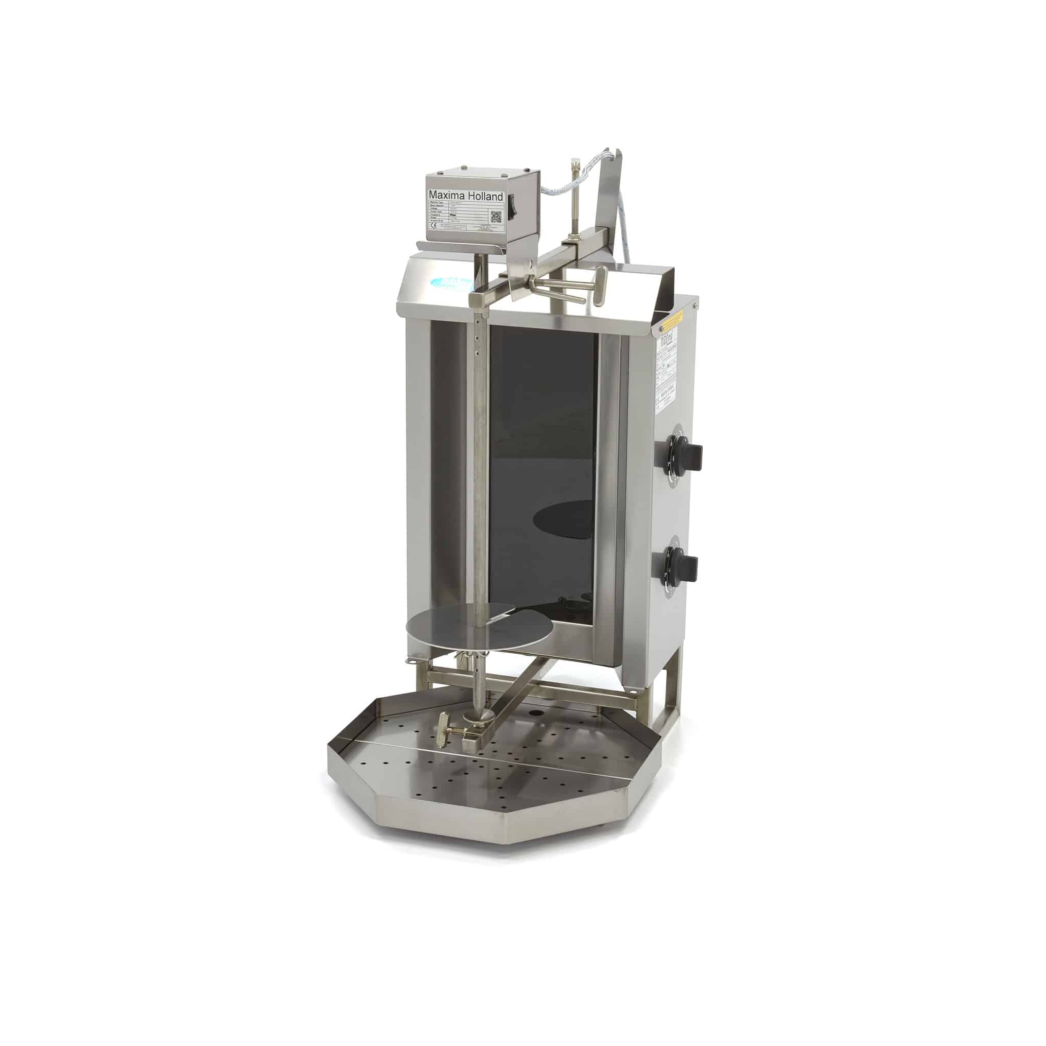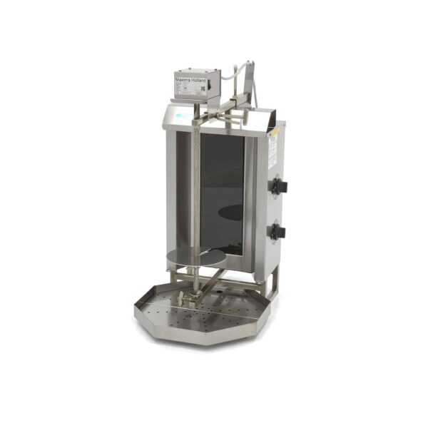Maxima Grătar kebab cu 2 arzătoare electrice și motor poziționat deasupra. Grătarul este ideal pentru prepararea delicioaselor gyros, kebab sau shaorma. Standardul include panouri reflectorizante din inox și tavă de colectare din inox cu filtru.