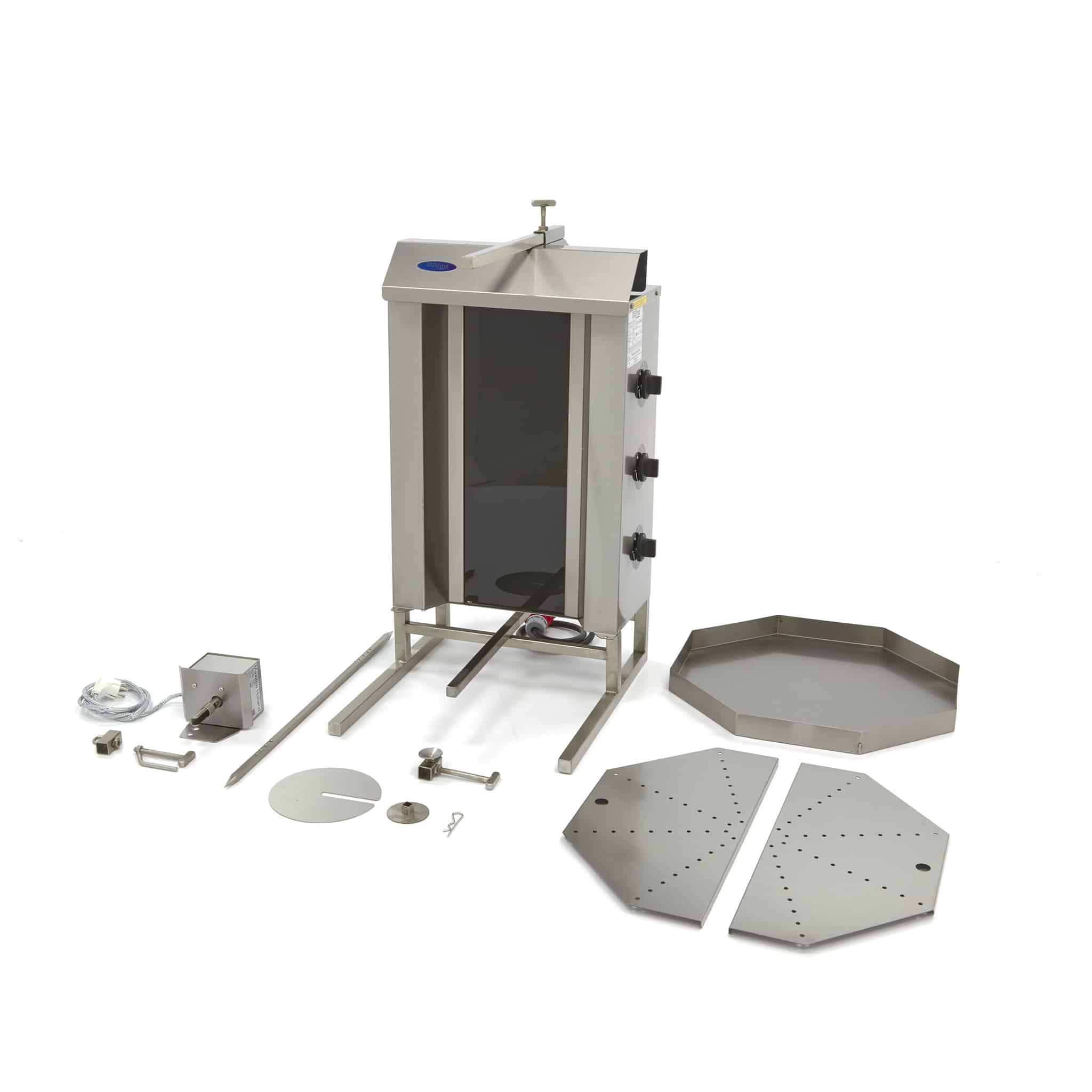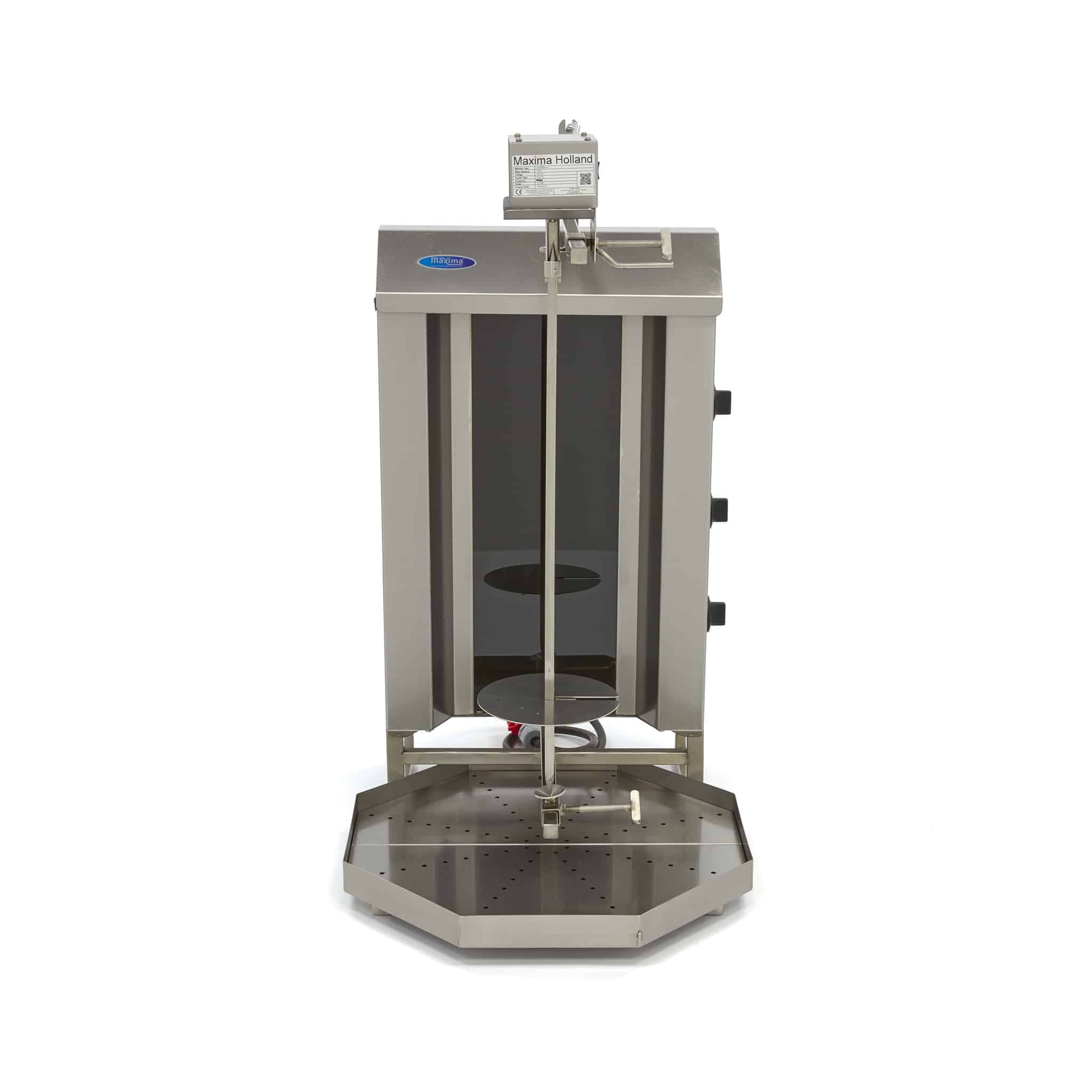 Maxima Grătar kebab cu 3 arzătoare electrice și motor poziționat deasupra. Acest grătar este ideal pentru prepararea delicioaselor gyros, kebab sau shaorma. Standardul include panouri reflectorizante din inox și tavă de colectare din inox cu filtru.