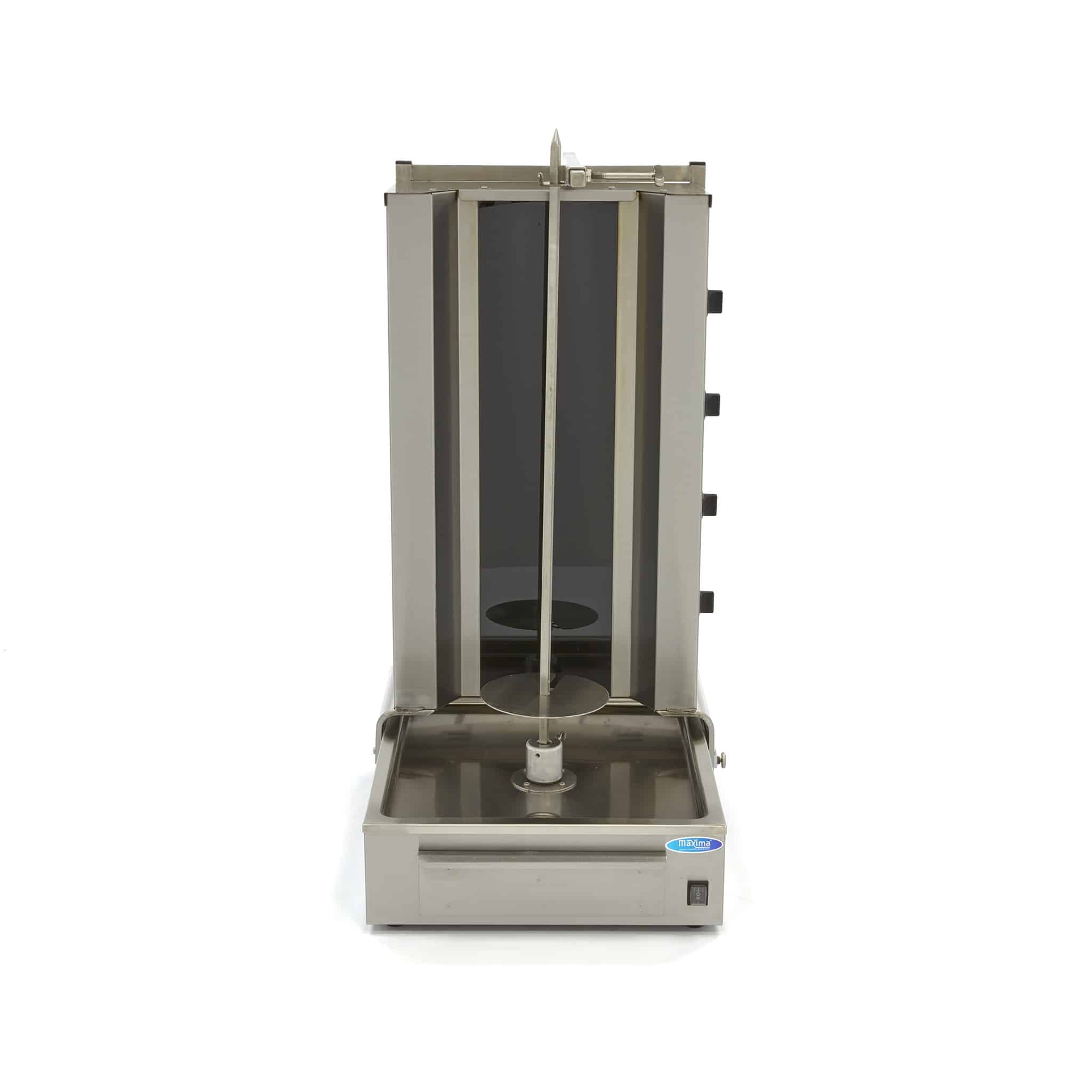 Maxima Grătar kebab cu 4 arzătoare electrice și motor poziționat jos. Acest grătar este ideal pentru prepararea delicioaselor gyros, kebab sau shaorma. Standardul include panouri reflectorizante din inox și tavă de colectare din inox cu filtru.