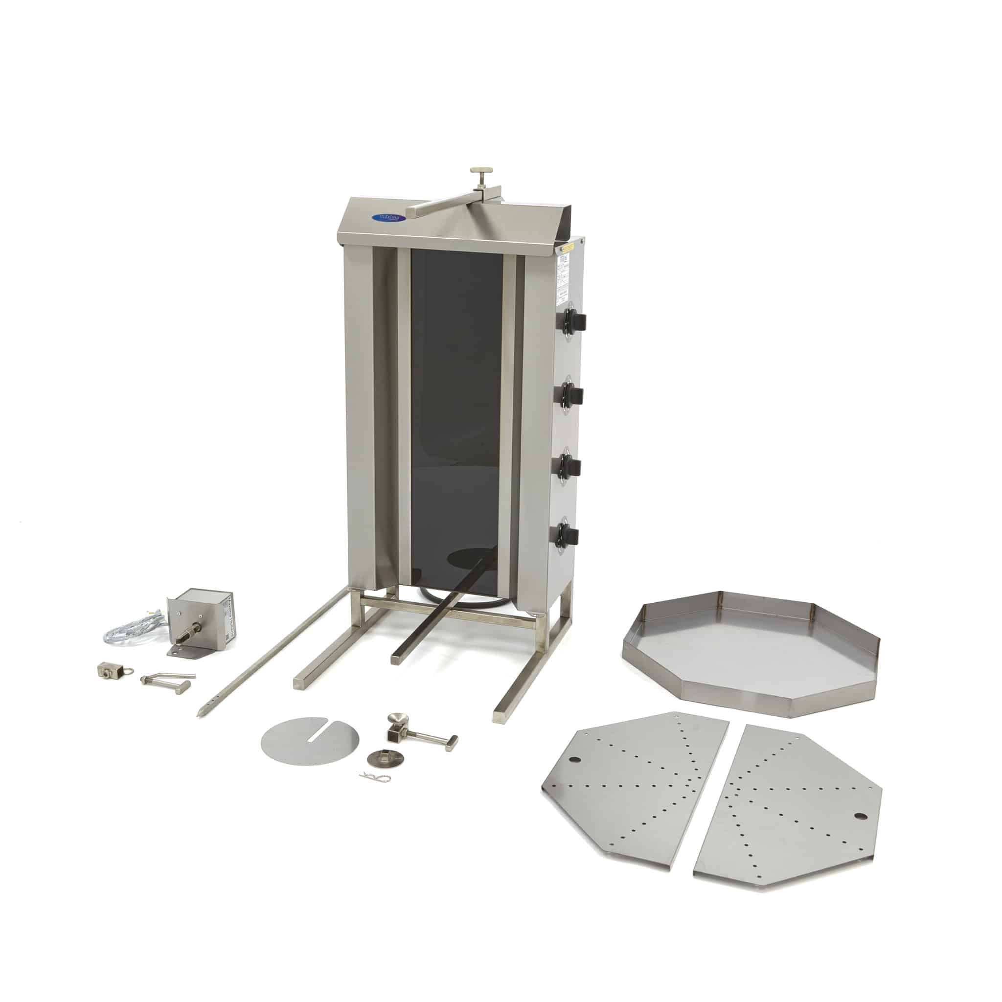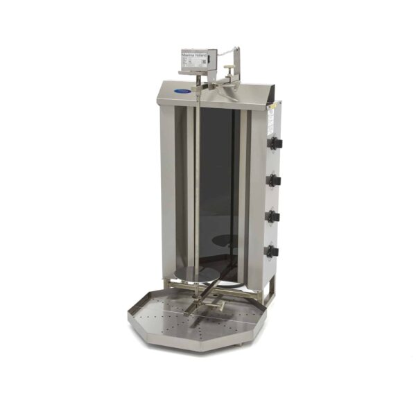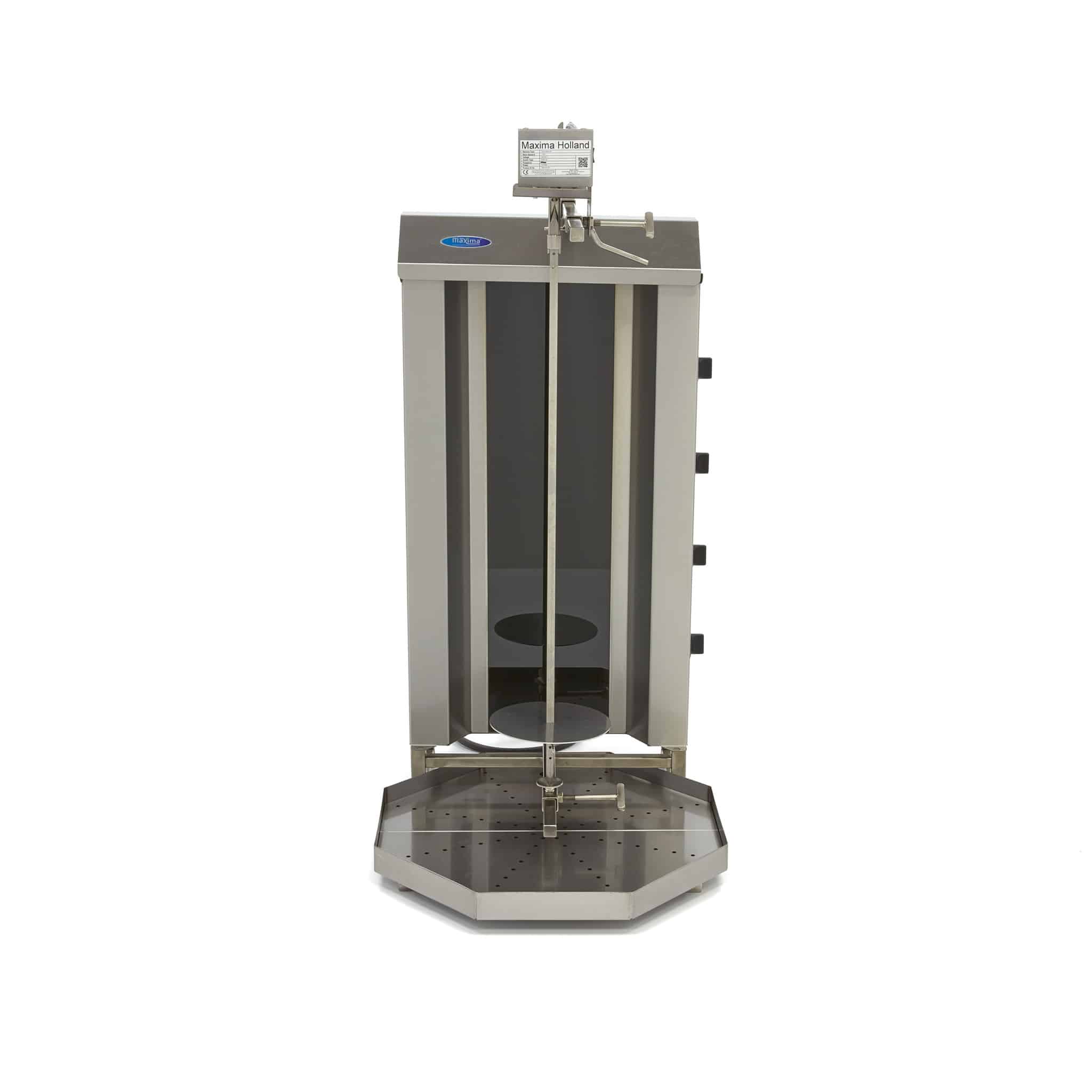 Maxima Grătar kebab cu 4 arzătoare electrice și motor poziționat în partea superioară. Acest grătar este ideal pentru prepararea delicioaselor gyros, kebab sau shaorma. Standardul include panouri reflectorizante din inox și tavă de colectare din inox cu filtru.