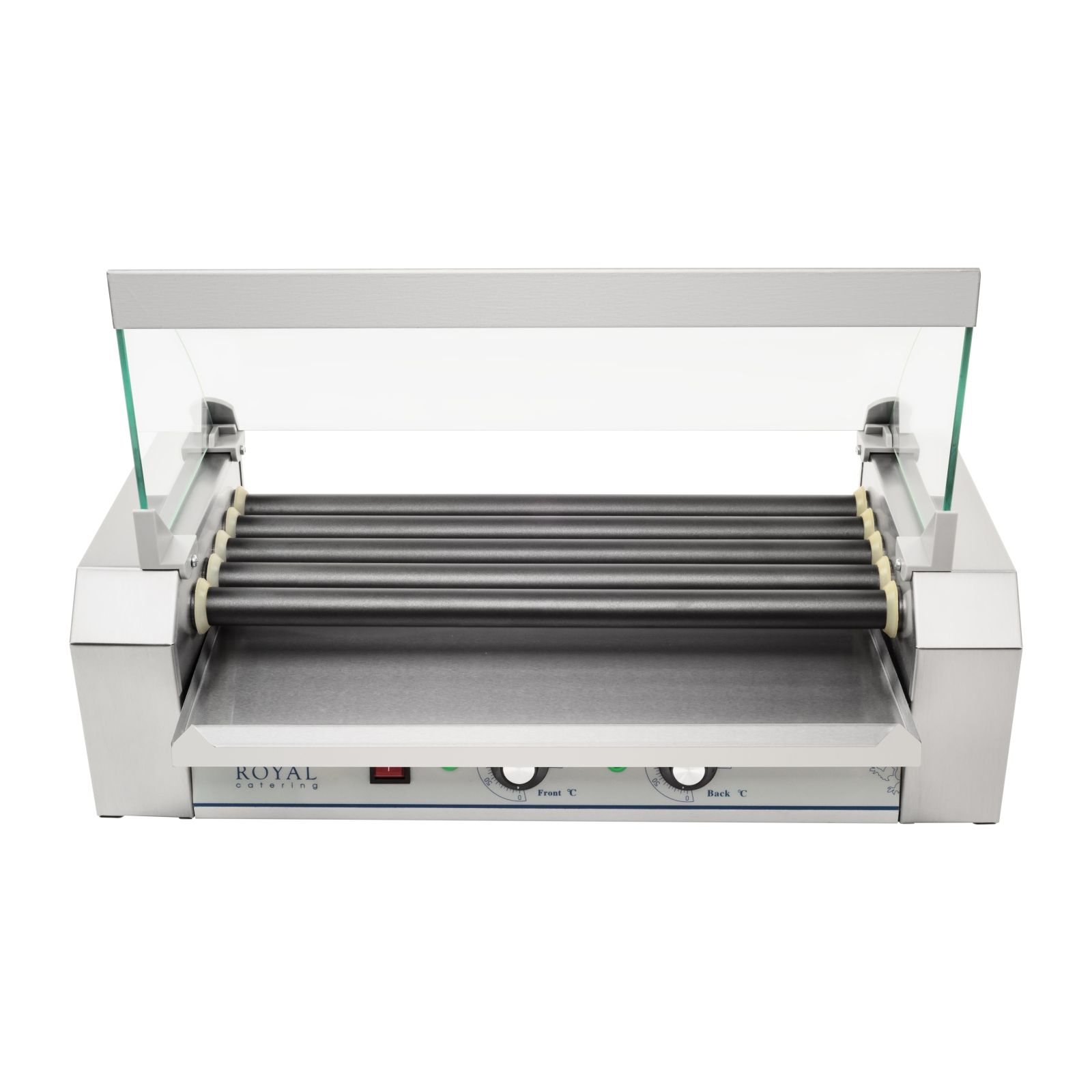 Grătarul pentru crenvurști RCHG-5T de la Royal Catering este echipat suplimentar cu un capac transparent care oferă protecție împotriva stropirii cu grăsime și ajută la menținerea temperaturii, precum și cu două butoane rotative pentru încălzire separată sau menținerea la cald a produselor grillate.