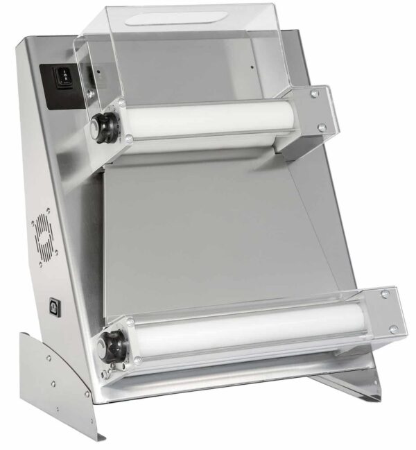Laminatorul electric pentru aluat cu două perechi de role este excelent pentru prepararea aluatului de pizza, paste, găluște și accelerează considerabil procesul de pregătire a preparatelor. Permite obținerea unui blat cu diametrul între 26 și 45 cm. Produsul este ideal atât pentru bucătării profesionale mari, cât și pentru cele mici din HoReCa.