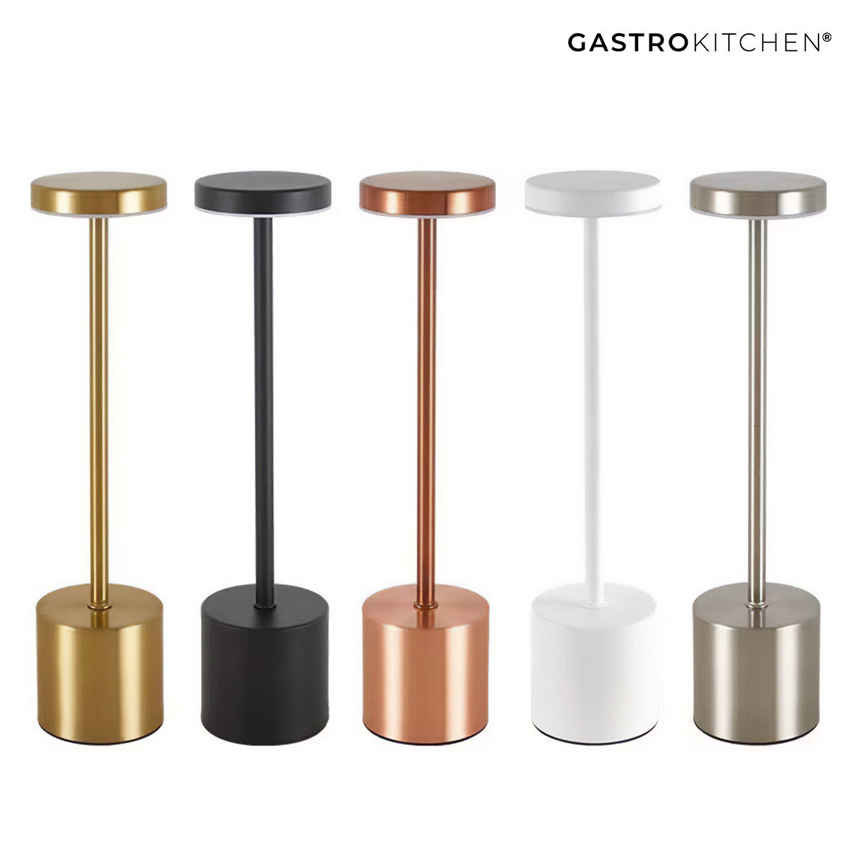 Lampă LED modernă cu control tactil, carcasă elegantă aurie, perfectă pentru a crea o atmosferă rafinată la masa din restaurant, cafenea sau biroul de acasă. Datorită bateriei integrate, funcției de reglare continuă a intensității (0,5–2 W) și celor trei nuanțe de lumină (caldă 3000 K, neutră 4500 K, rece 6000 K), poți seta exact ambianța dorită – fără cabluri și cu stil.