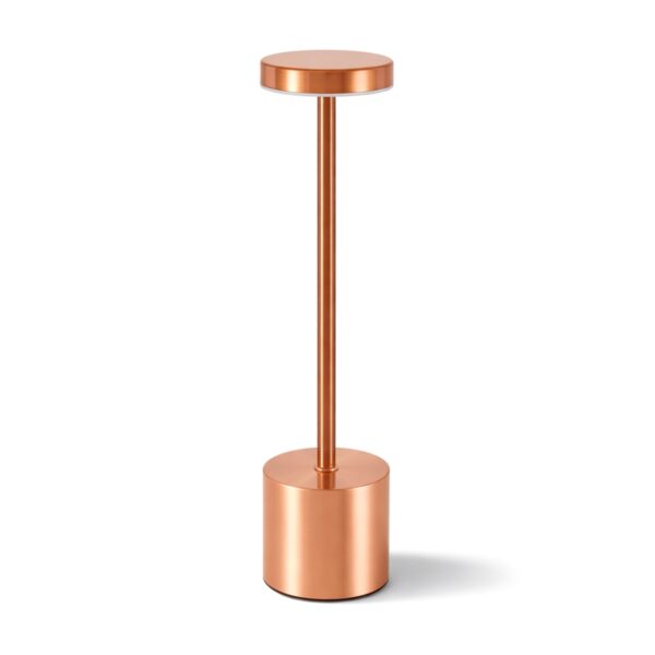 Lampă LED modernă cu control tactil, carcasă elegantă în nuanță aur roz, perfectă pentru a crea o atmosferă rafinată la masa din restaurant, cafenea sau biroul de acasă. Datorită bateriei integrate, funcției de reglare continuă a intensității (0,5–2 W) și celor trei temperaturi de culoare (caldă 3000 K, neutră 4500 K, rece 6000 K), poți seta ambianța dorită – fără cabluri și cu stil.