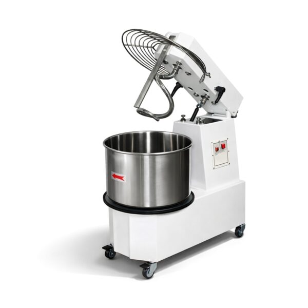 Construcția din oțel este acoperită cu vopsea rezistentă la temperaturi ridicate. Cuvă, spirală, divizorul central de aluat și grilajul de protecție, toate componentele care intră în contact direct cu alimentele, sunt fabricate din inox. Poate funcționa cu motor monofazat sau trifazat. Malaxorul este livrat ambalat și fixat cu benzi în cutie de lemn. În interiorul ambalajului veți găsi manualul de utilizare. Operare simplă cu două butoane: verde START, roșu STOP. Echipat cu 4 roți, dintre care 2 cu frână, pentru manevrare ușoară.
