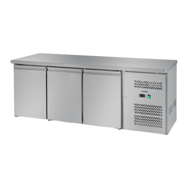 Nu mai aveți loc pentru alte preparate sau băuturi? Nicio problemă, această masă frigorifică este echipată cu trei dulapuri frigorifice separate. Aici puteți depozita separat alimente proaspete, sosuri, toppinguri și garnituri. Organizarea eficientă este asigurată de cele trei rafturi mari din grilaj. Ușile din oțel inoxidabil cu garnitură de cauciuc asigură închiderea ermetică a compartimentelor.