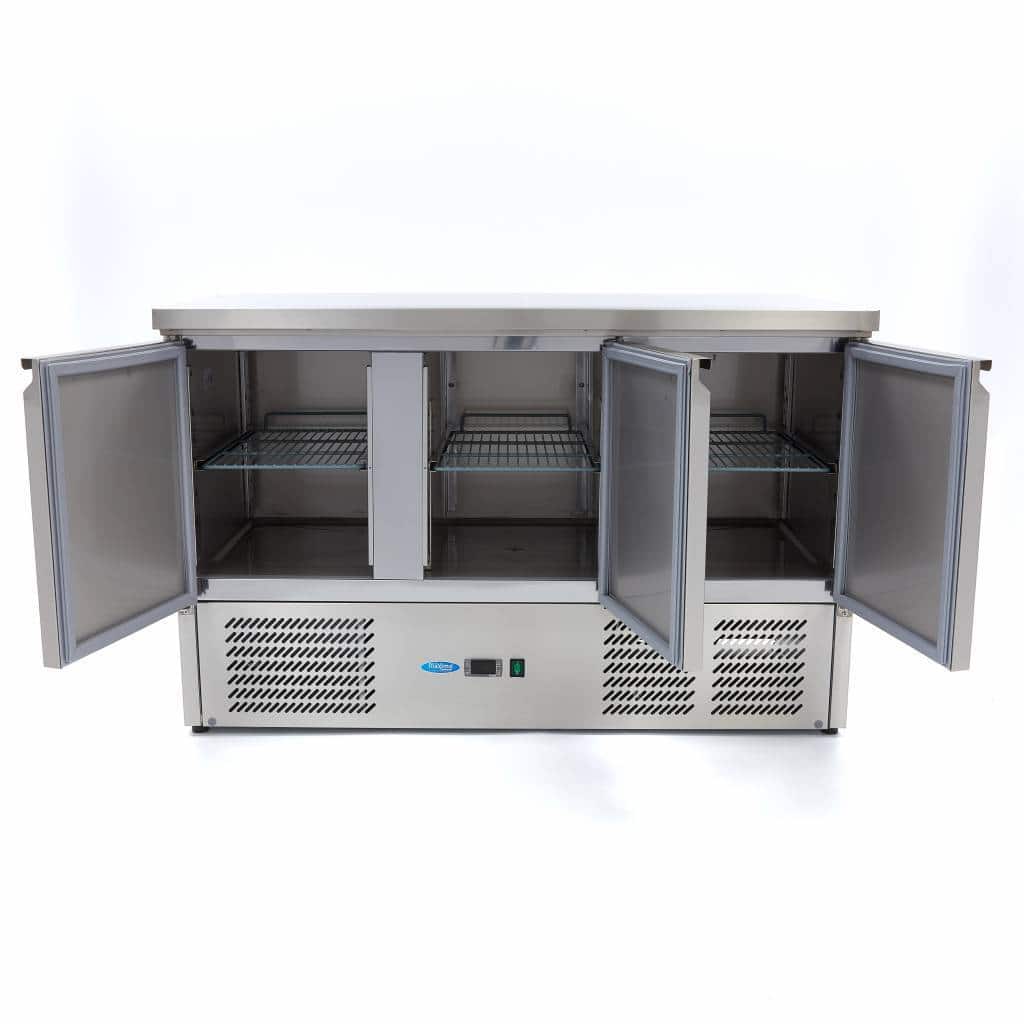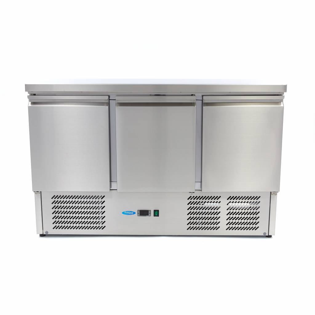 Un echipament frigorific de calitate este esențial într-o bucătărie profesională. Alimentele care nu sunt conservate sau ambalate rămân proaspete mai mult timp și își păstrează calitatea dacă sunt depozitate într-o masă frigorifică de bar. Avantajul este că aveți la dispoziție nu doar un sistem de răcire, ci și o suprafață de lucru completă din inox pentru pregătirea ingredientelor proaspete. Acest sistem frigorific cu ventilator are o capacitate de 400 litri. În spatele celor trei uși robuste din inox se află două rafturi reglabile.