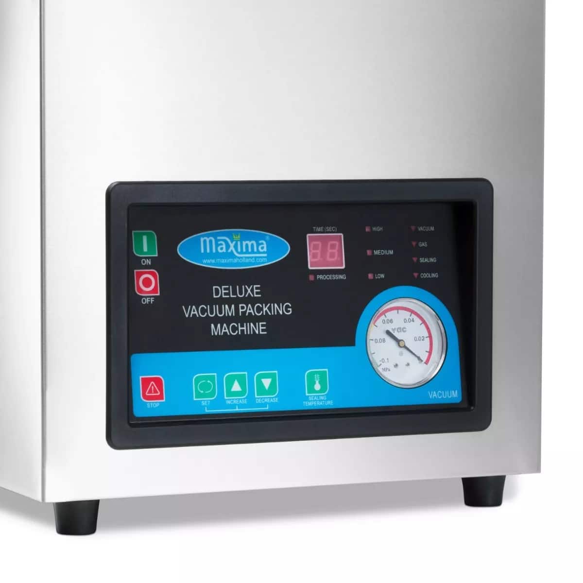 - Panoul de control intuitiv, amplasat în față, permite setarea timpului de sigilare, temperaturii de sigilare, presiunii de vid și timpului de răcire.