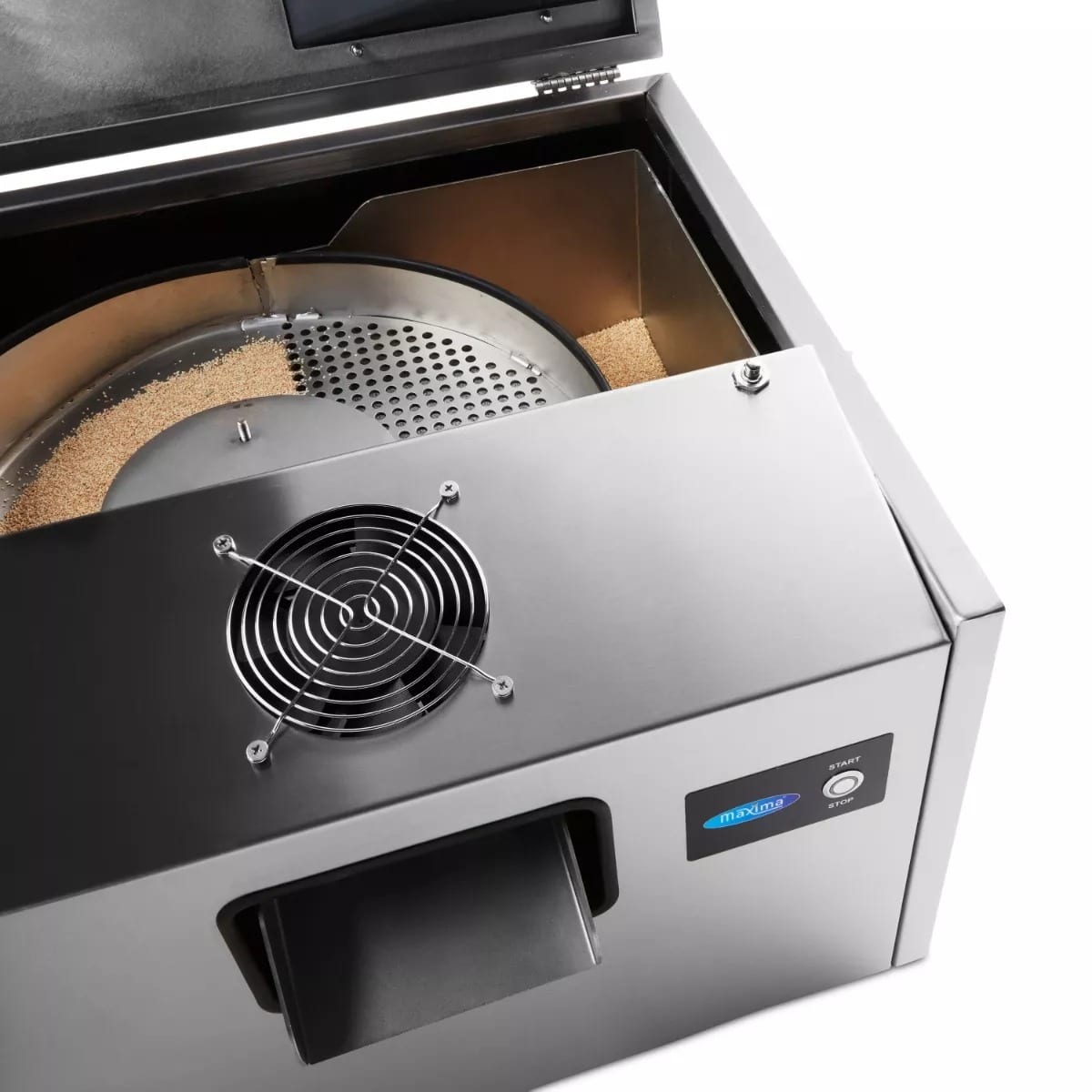 - Tacâmurile intră într-un bol vibrator în interiorul aparatului. Vibrațiile fac ca tacâmurile să se frece de granule, lustruind întreaga suprafață a cuțitului, furculiței sau lingurii. Prin vibrații, tacâmurile sunt ghidate automat către deschiderea din față. Plasați un recipient sub aceasta pentru a colecta tacâmurile lustruite, gata de utilizare. Granulele pentru acest aparat sunt incluse în pachet.