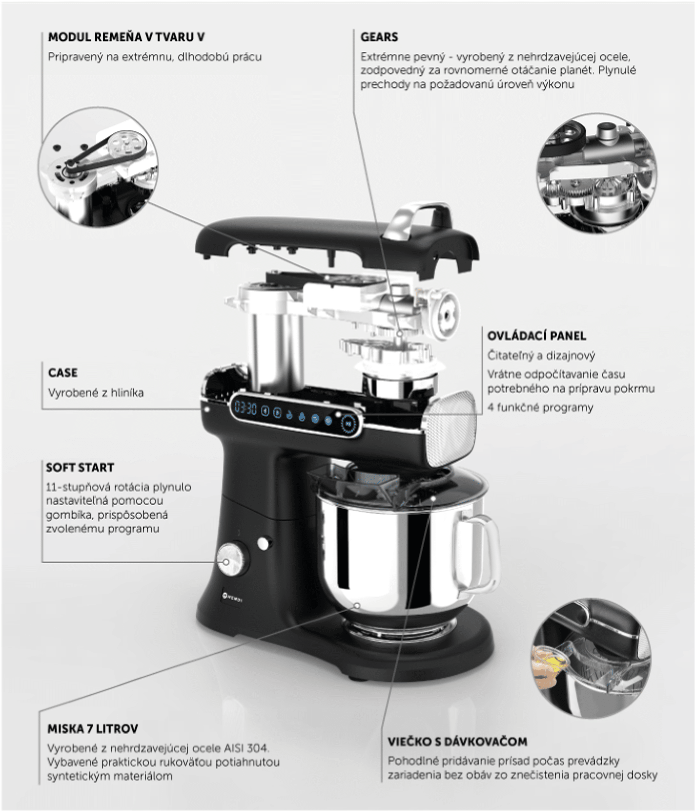 - Capacitate: 7 l – 0,2 – 1,5 kg făină – 2 – 20 albușuri – 150 – 1.500 ml frișcă dulce – 0,1 – 2 l smântână proaspătă.