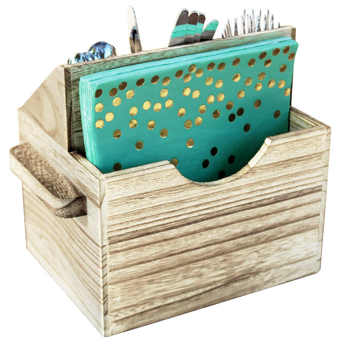 Elegantul organizator de tacâmuri din lemn cu compartimente dedicate și spațiu posterior pentru șervețele, realizat integral din lemn. Datorită dimensiunilor compacte 17 × 13 × 11,5 cm, economisește spațiu pe masă sau pe bufet și menține cuțitele, furculițele, lingurile și șervețelele perfect organizate.