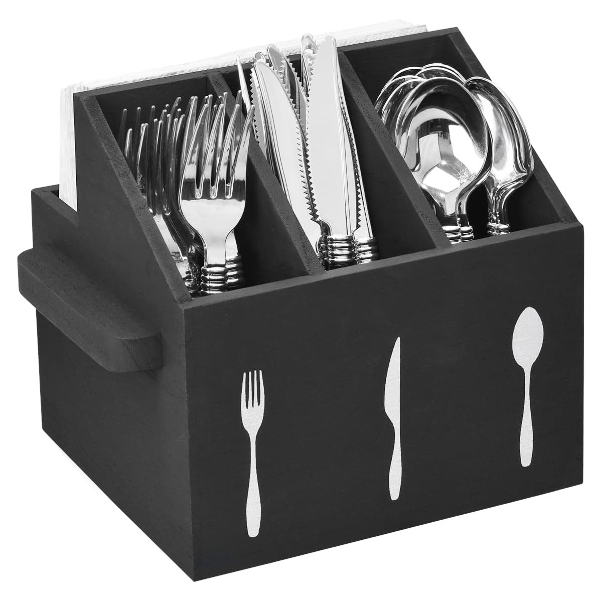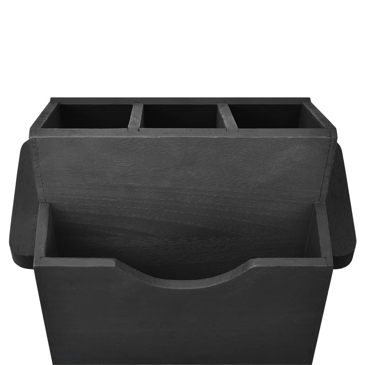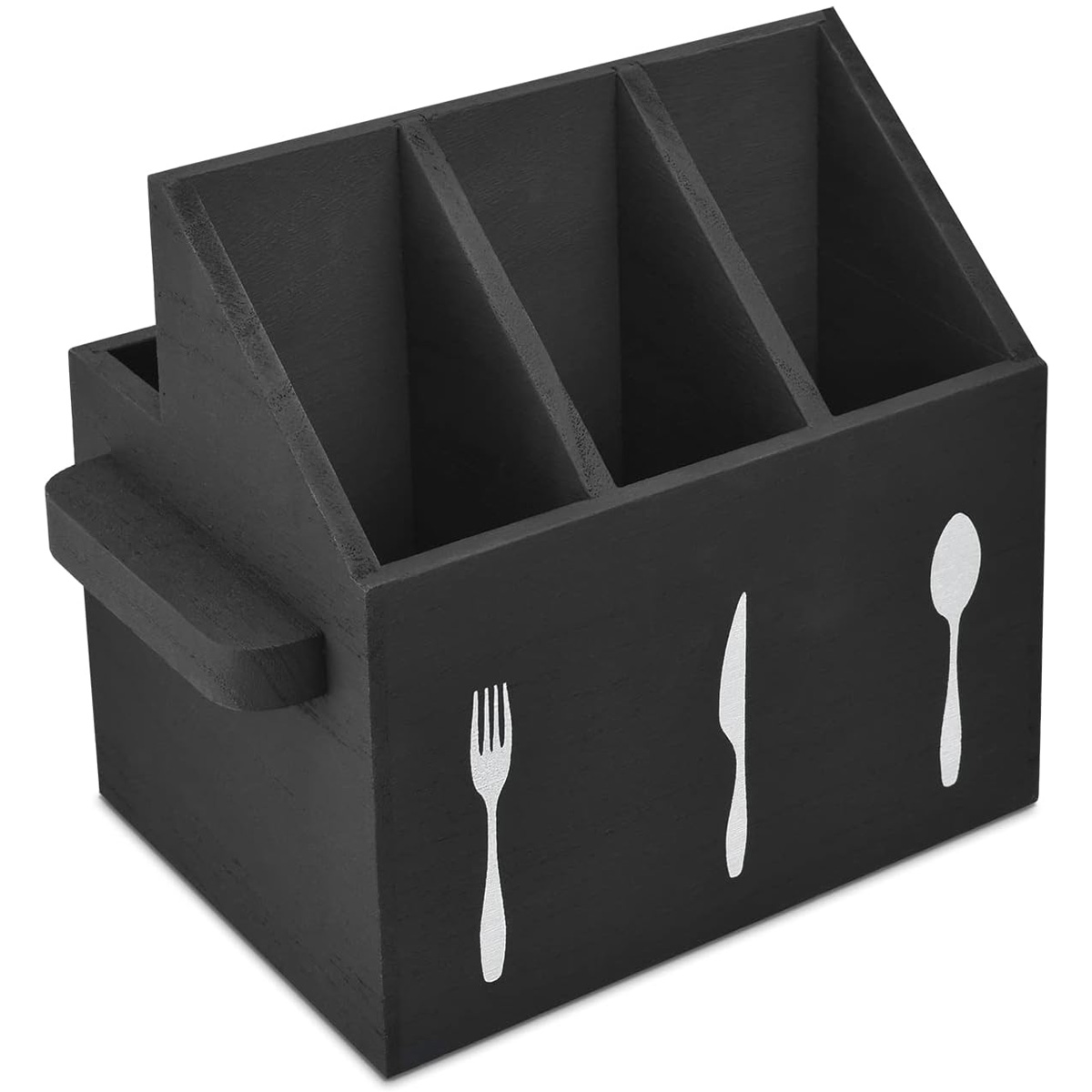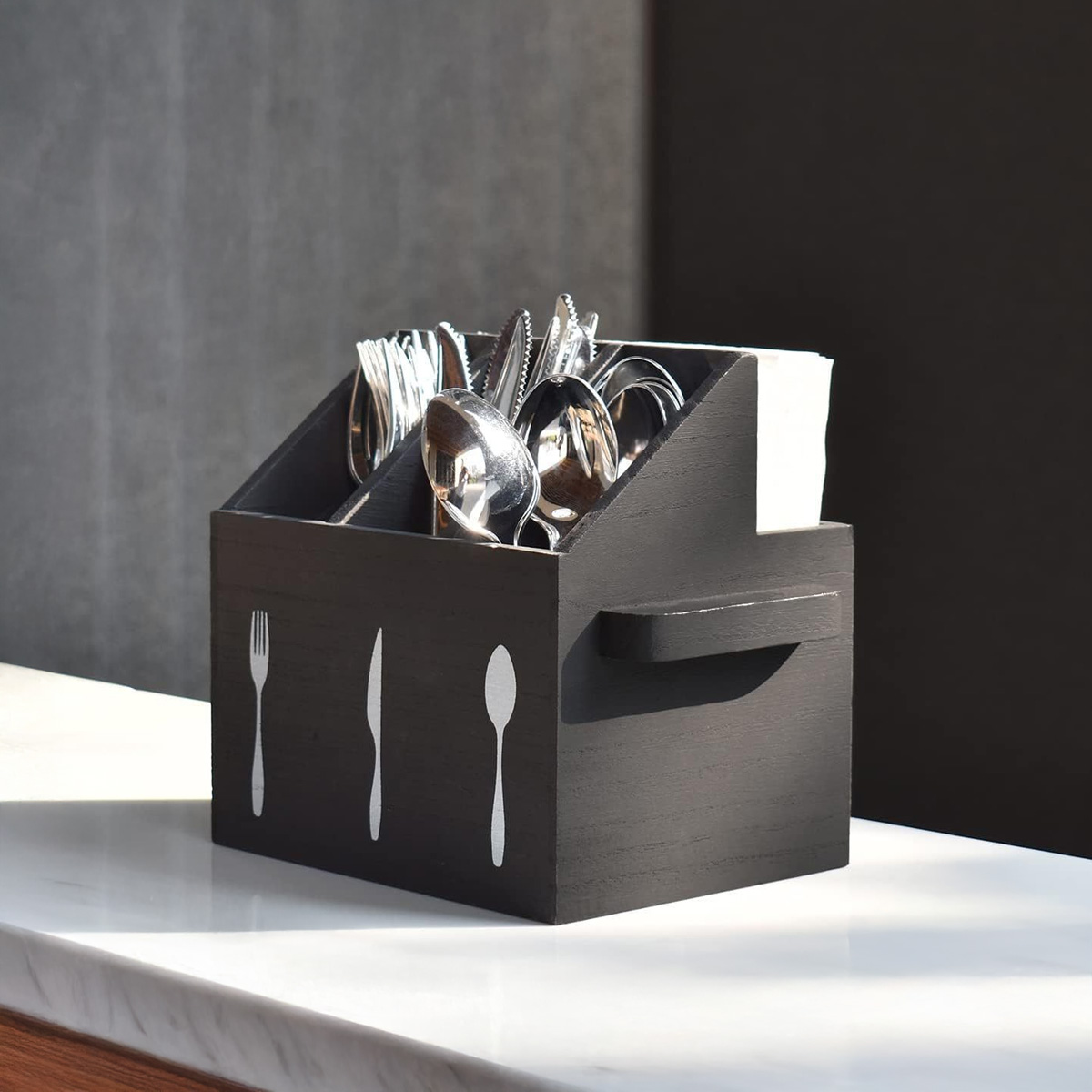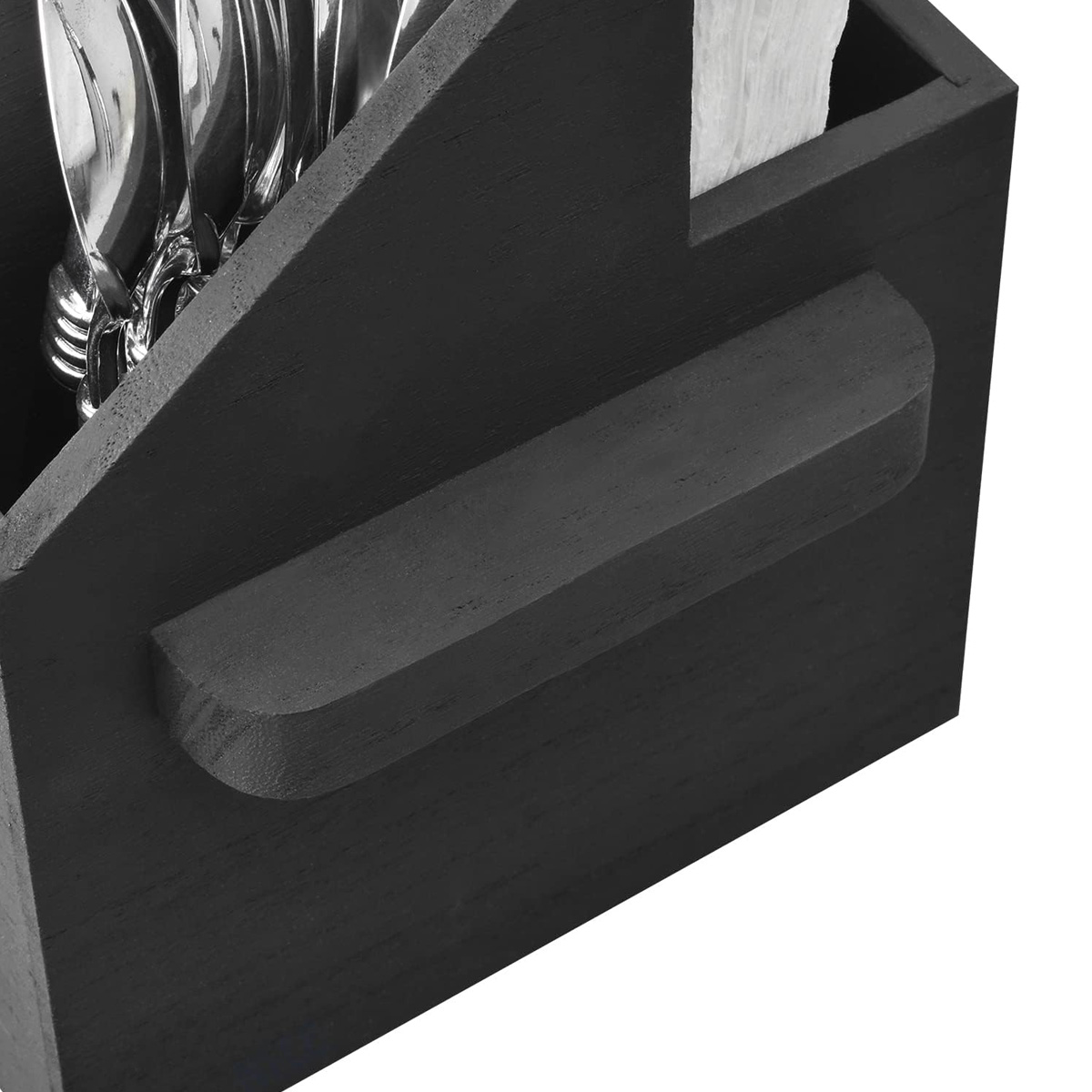 Elegant organizator de tacâmuri din lemn cu compartimente dedicate și spațiu în spate pentru șervețele, finisaj mat negru. Datorită dimensiunilor compacte 17 × 13 × 11,5 cm, economisește spațiu pe masă sau pe bufet și păstrează cuțitele, furculițele, lingurile și șervețelele perfect organizate.
